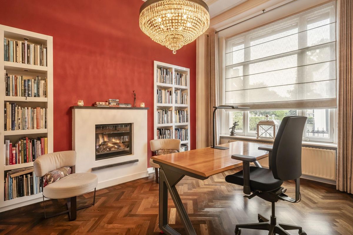 De markante werkkamer is afgewerkt met een visgraat parketvloer, spachtelputz wanden en een stucwerk plafond voorzien van een platte plint, sierlijsten en ornamenten. De werkkamer beschikt over een gashaard en vaste inbouwkasten.