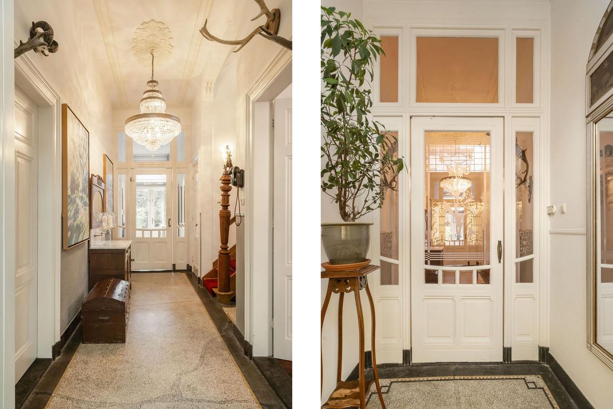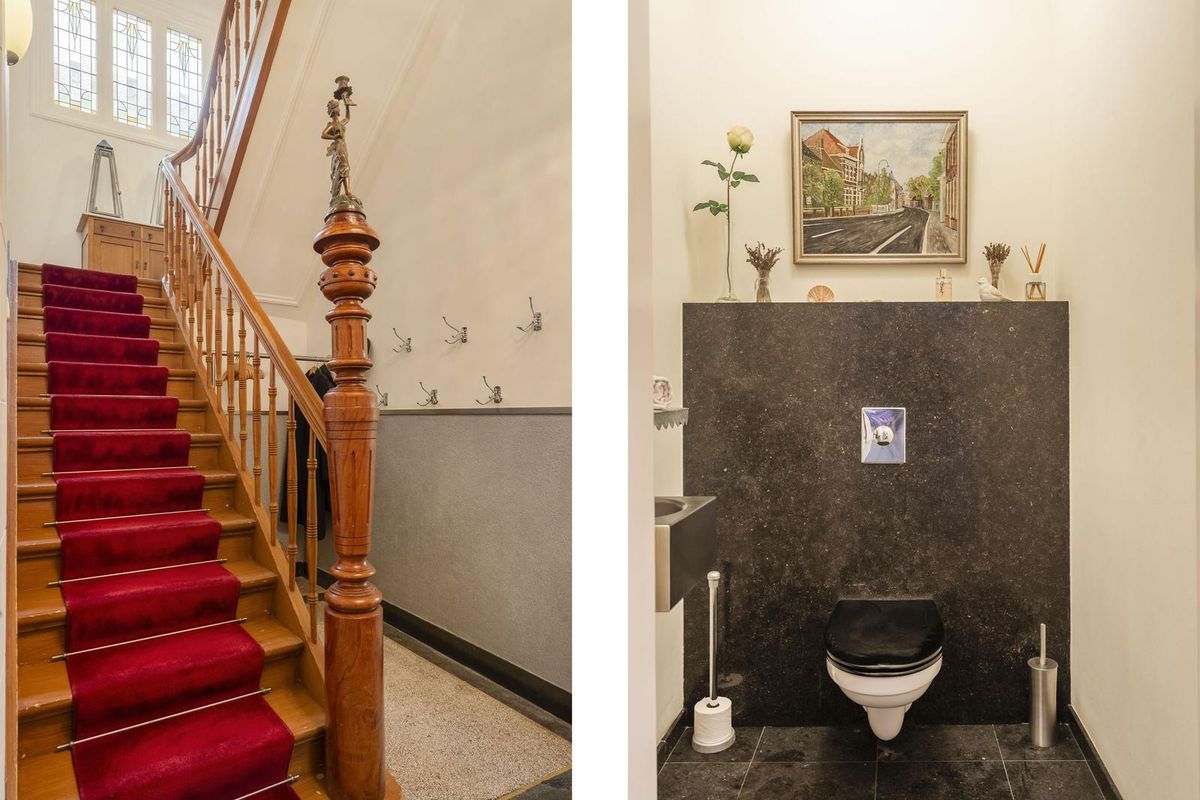 De royale entree is te bereiken middels de bordestrap en klassieke dubbele voordeur voorzien van glas-in-lood ramen. De entree is afgewerkt met een Terazzo vloer, deels stucwerk, deels spachtelputz wandafwerking en stucwerk met een platte plint, sierlijsten en ornamenten als plafondafwerking. Na de tochtdeur loopt de entree door en is er toegang tot het toilet, de woonkamer, de werkkamer, de woonkeuken, de garderobe en de bordestrap voorzien van een traploper naar de eerste verdieping. Het royale toilet is afgewerkt met een tegelvloer, stucwerk wandafwerking, Belgisch hardsteen achter het closet en een stucwerk plafond. Het toilet is voorzien van een hangend closet en een fonteintje.