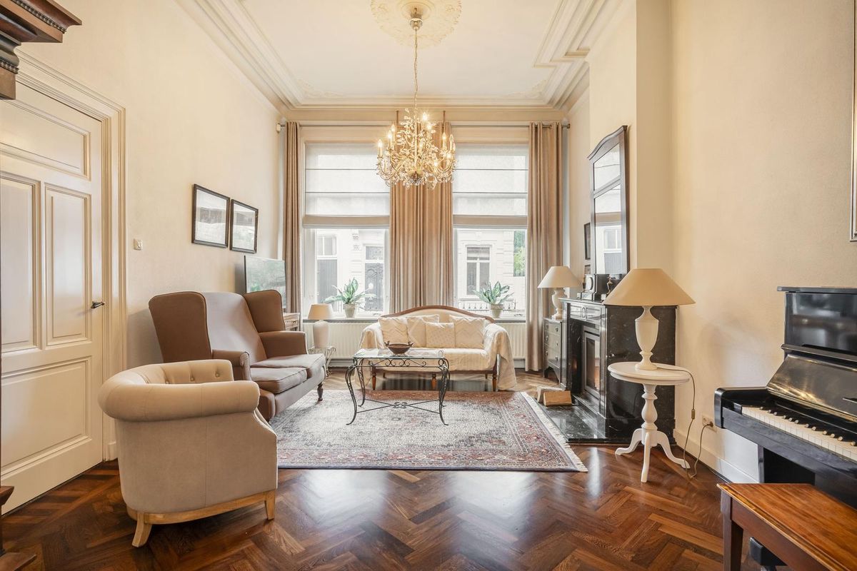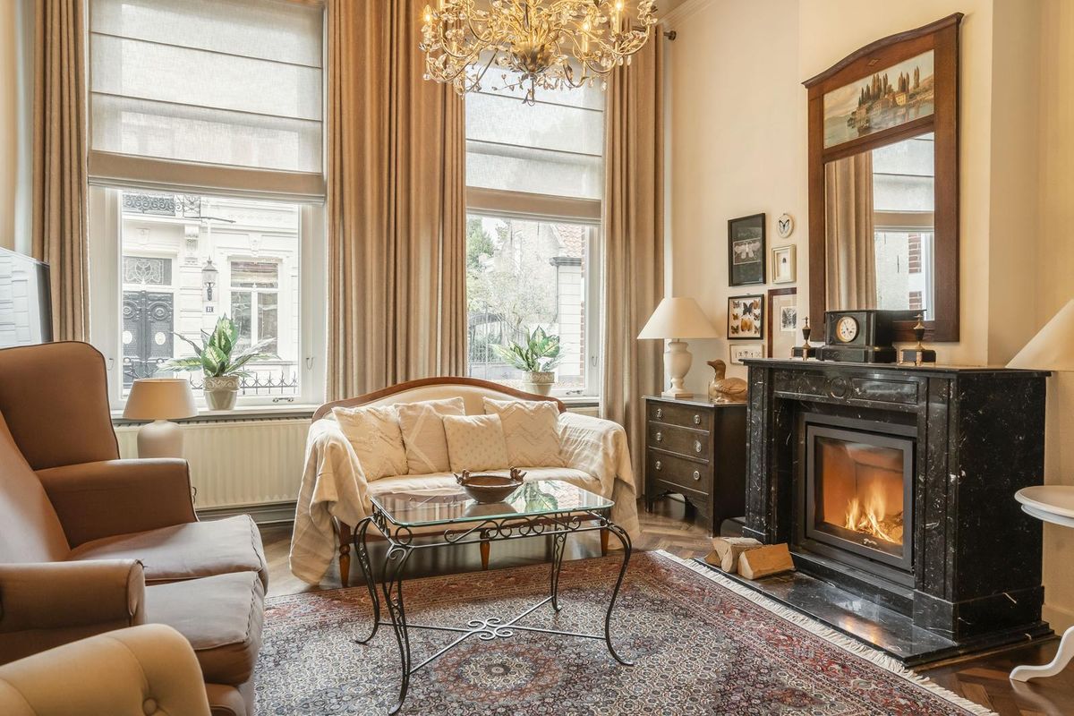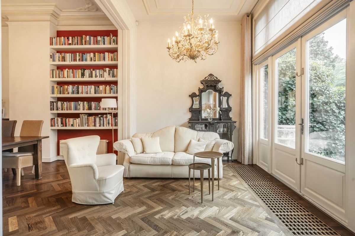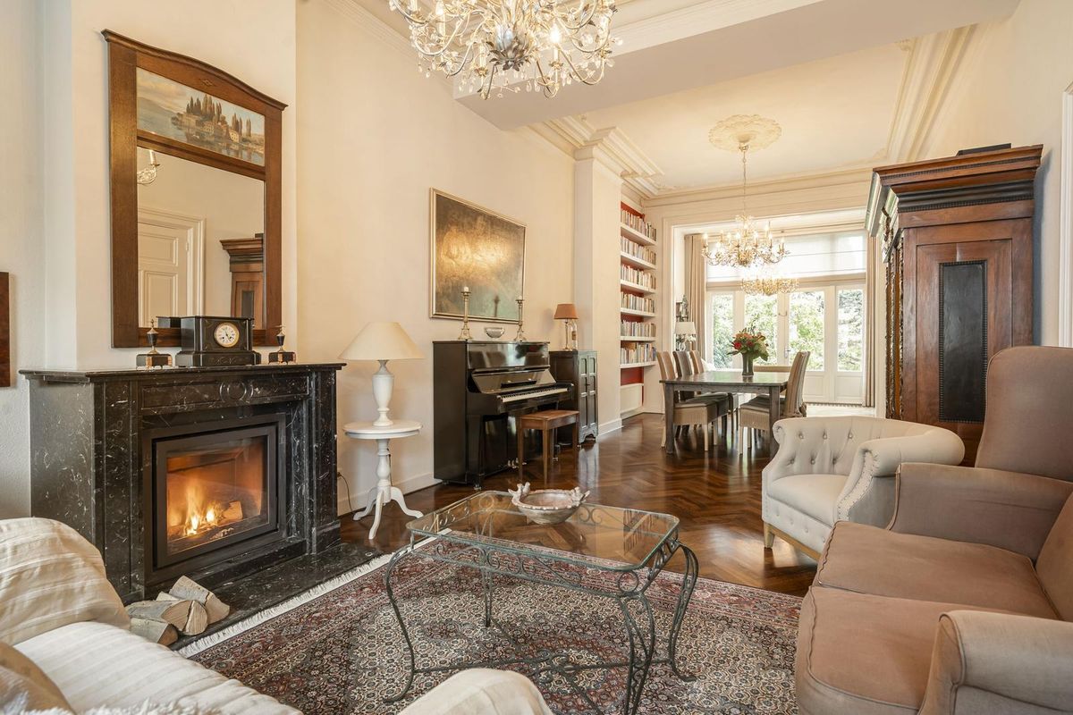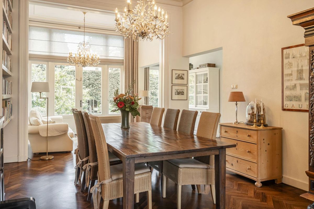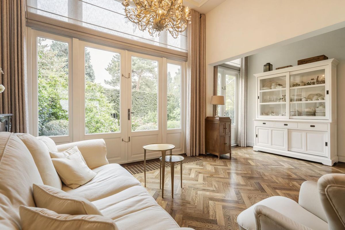 De royale woonkamer is afgewerkt met een visgraat parketvloer, spachtelputz wanden en een stucwerk plafond voorzien van sierlijsten en ornamenten. De woonkamer beschikt over een sfeervolle Barbas houtkachel met schouw en middels de openslaande tuindeuren is de achtertuin bereikbaar. Vanuit de woonkamer heeft u middels de royale raampartijen een schitterend uitzicht over de achtertuin.