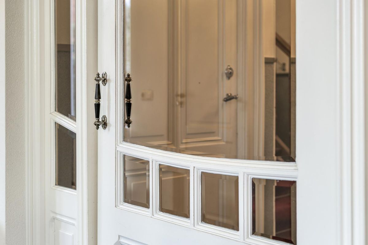 De overloop op de eerste verdieping, te bereiken middels de statige bordestrap, is afgewerkt met een visgraat parketvloer, stucwerk wandafwerking en een stucwerkplafond voorzien van een platte plint. De royale overloop geeft toegang tot drie slaapkamers, de badkamer en de bordestrap naar de tweede verdieping. Boven het bordes bevinden zich eveneens sfeervolle glas-in-lood ramen.