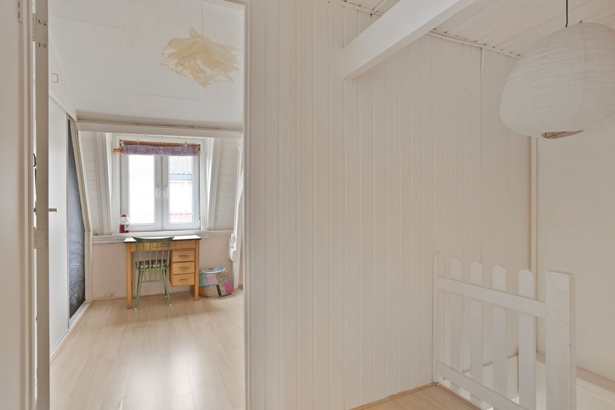 De ruime overloop geeft toegang tot twee slaapkamers. De slaapkamer aan de achterzijde is royaal van formaat en kan eventueel worden opgesplitst in twee kamers. De slaapkamer aan de voorzijde beschikt over een inbouwkast. Op de overloop bevindt zich daarnaast een separaat toilet met fonteintje.