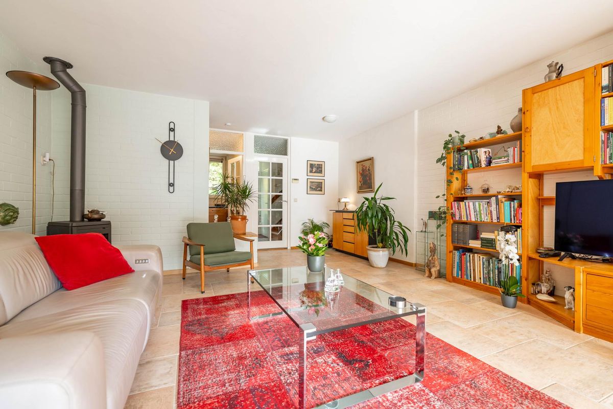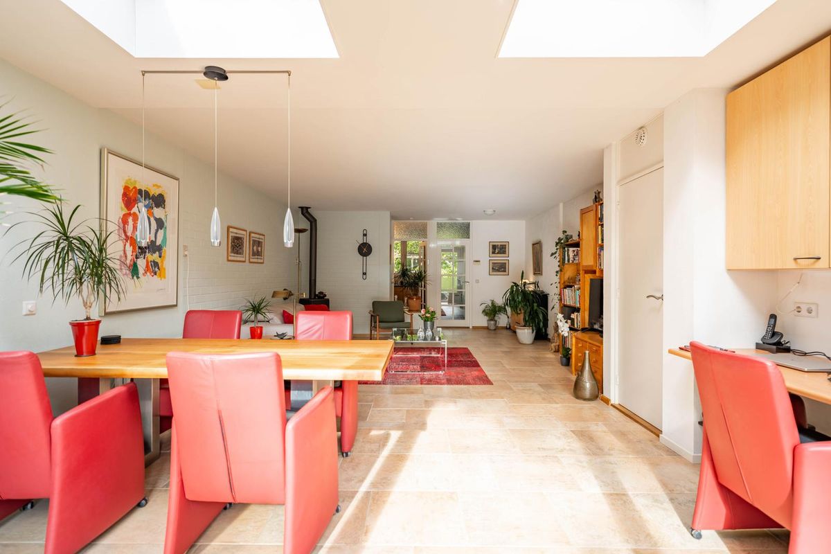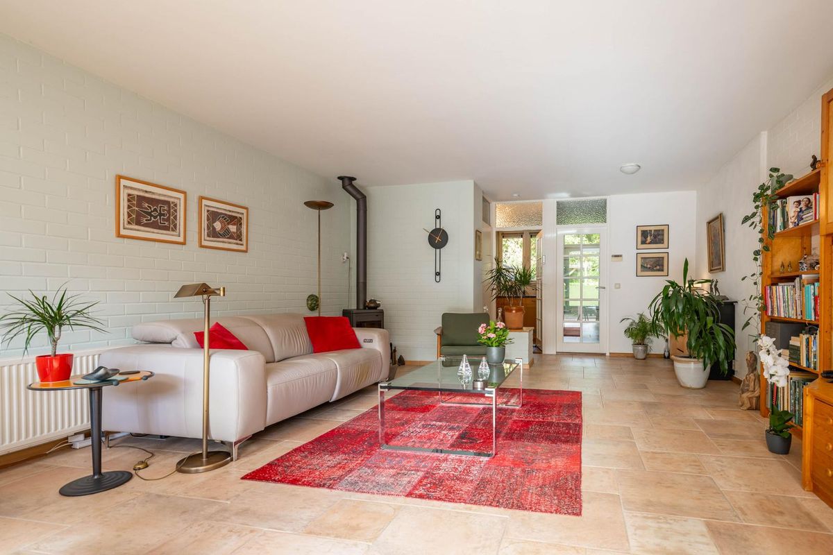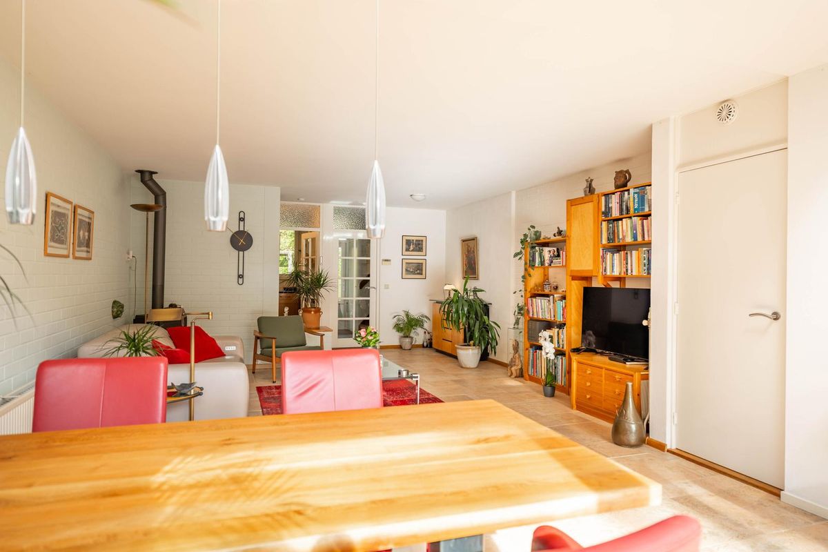 De woning is in 2007 uitgebouwd en voorzien van een schuifpui naar de zonnige achtertuin. De woonkamer ademt sfeer met de houtkachel en de fijne bovenlichten die zorgen voor een prachtige natuurlijke lichtinval — alsof het buiten een beetje mee naar binnen komt.