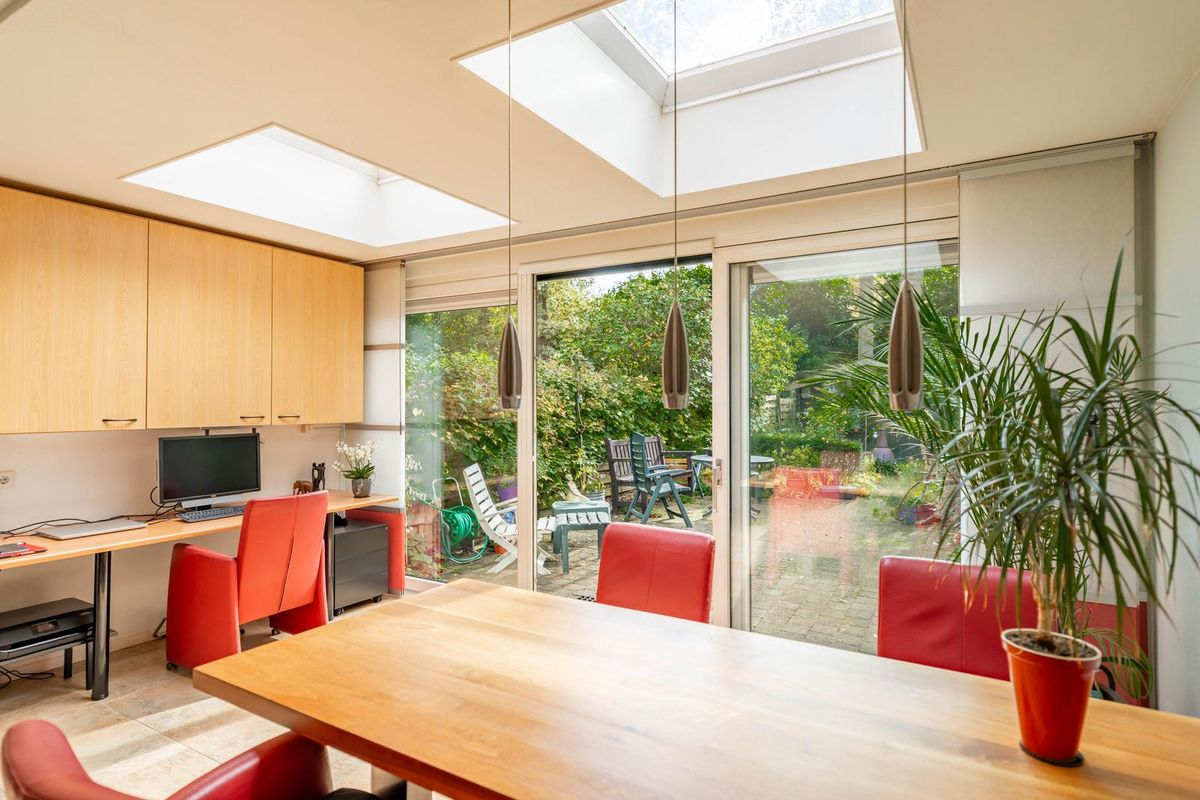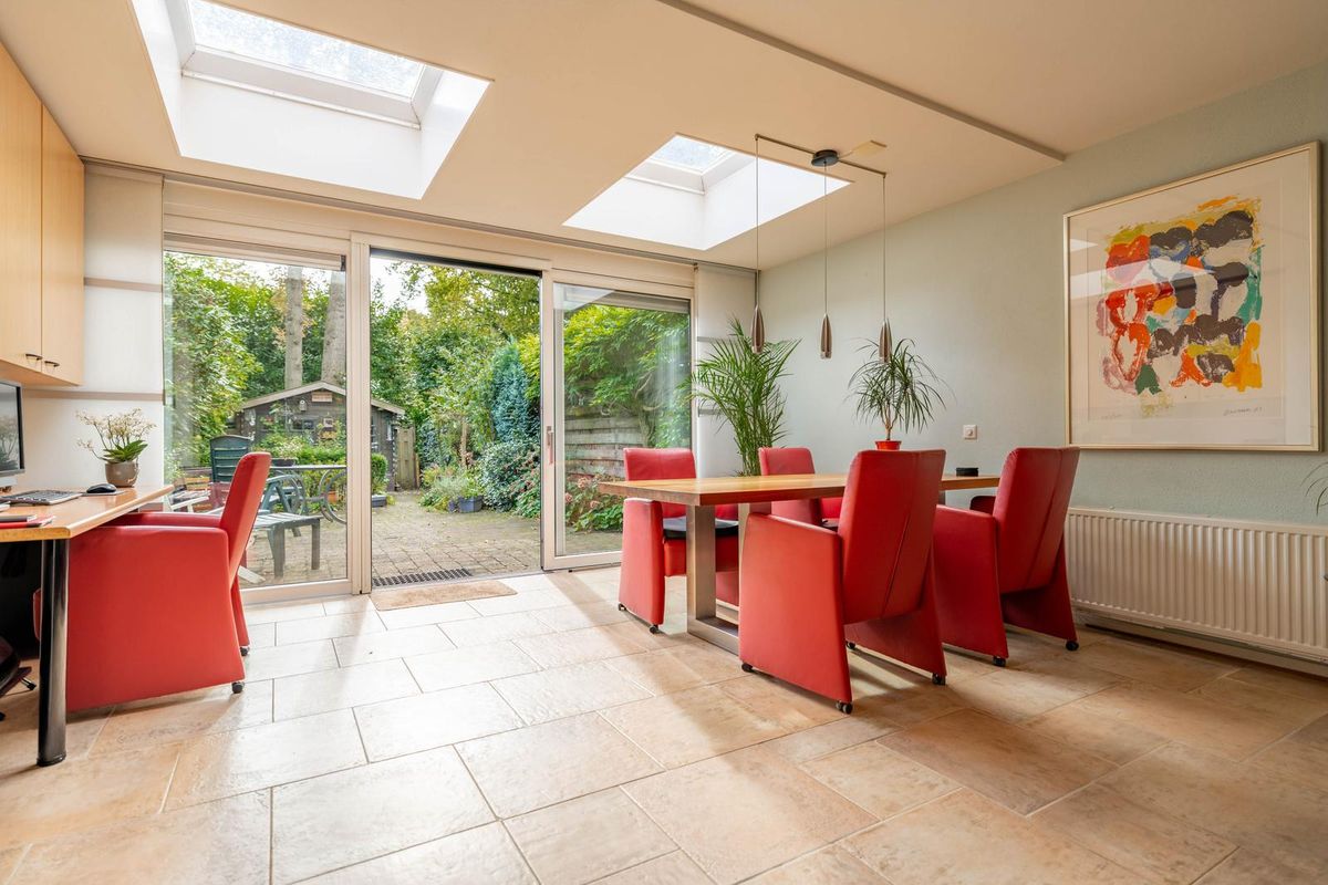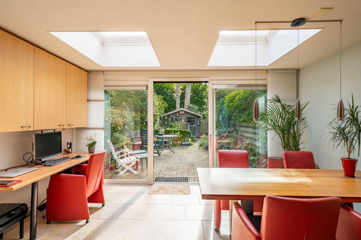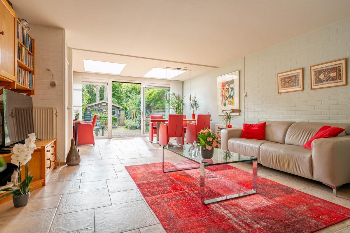 De woning is in 2007 uitgebouwd en voorzien van een schuifpui naar de zonnige achtertuin. De woonkamer ademt sfeer met de houtkachel en de fijne bovenlichten die zorgen voor een prachtige natuurlijke lichtinval — alsof het buiten een beetje mee naar binnen komt.