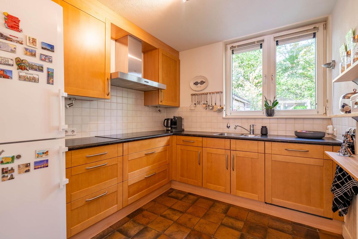 De keuken ligt aan de voorkant van de woning. Aansluitend vind je een praktische bijkeuken met aansluitingen voor wasmachine en droger én een fonteintje – handig én netjes weggewerkt.