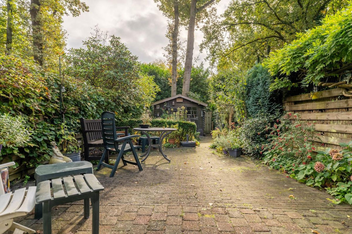 -Zonnige achtertuin met houten berging en achterom;
