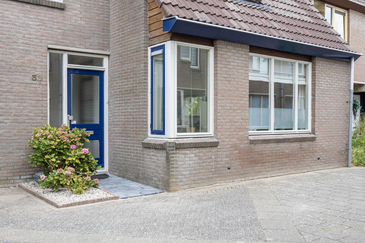 Aan de voorzijde ziet u twee deuren, de voordeur met huisnummer 33 en een deur naar de berging/wasruimte. We gaan via de voordeur naar binnen en stappen de hal in, met de meterkast en een plavuizen vloer.