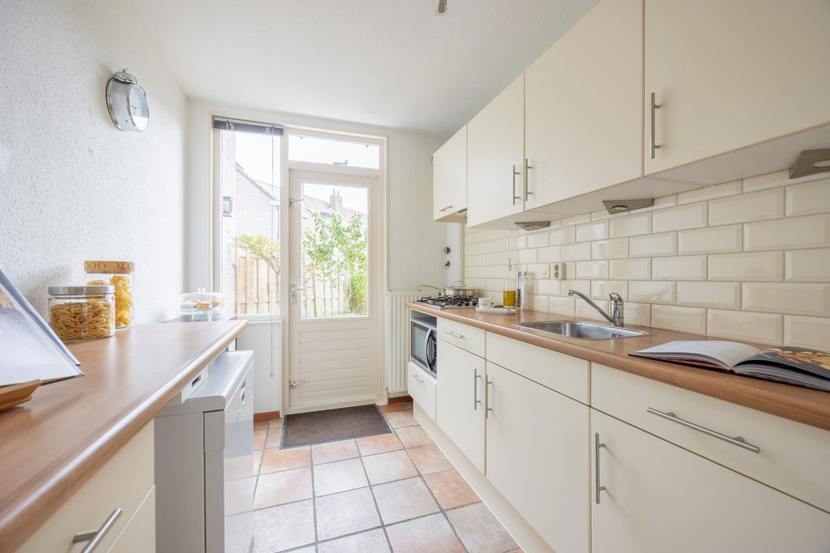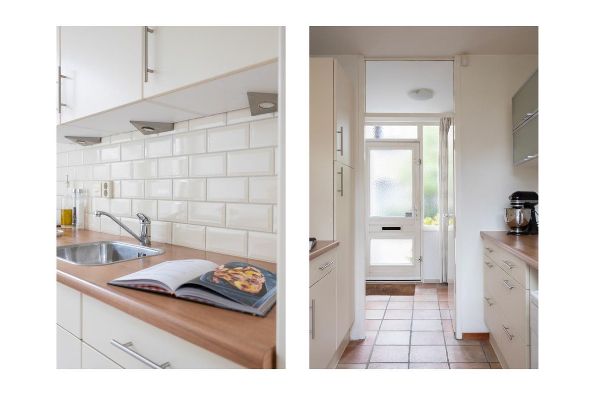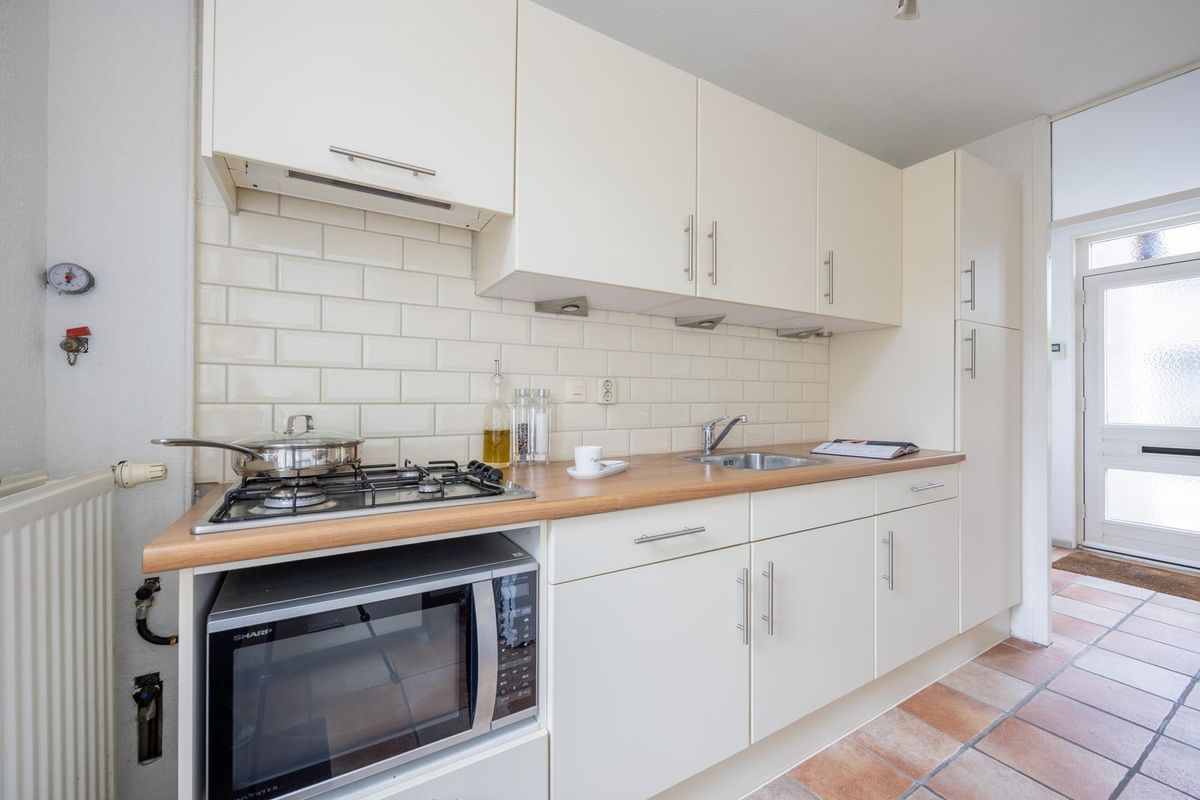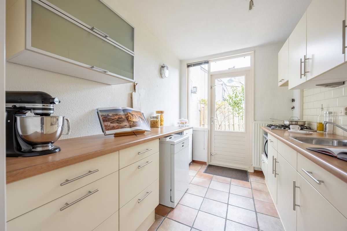 Een van de voordelen van deze woning is de dichte keuken die, net als de woonkamer, een deur naar de tuin heeft. Aan twee kanten staat een wandopstelling met een houtlook blad en de gaskookplaat, afzuigkap en koelkast zijn ingebouwd. Deze keuken vormt een goede basis om eigen apparatuur neer te zetten, en te stylen met mooie keukenaccessoires.