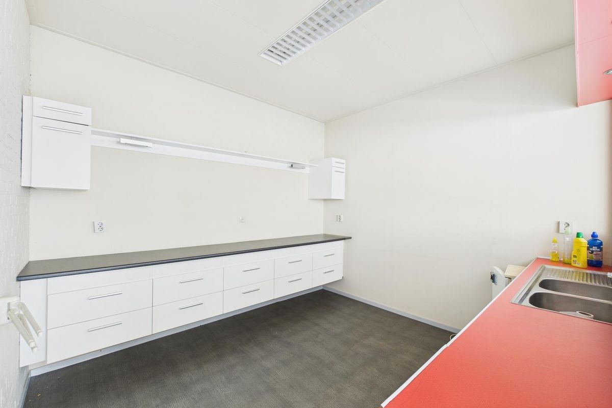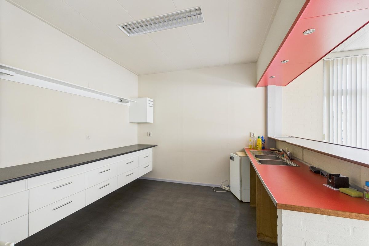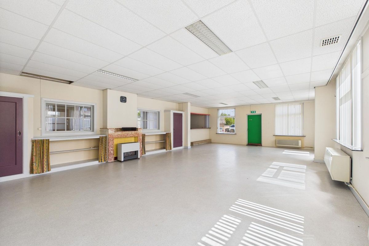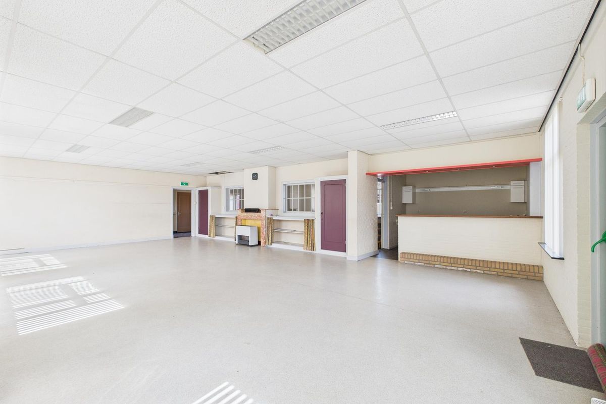 Aan de rechterzijde ligt het voormalige klaslokaal: een grote, open ruimte met veel licht en een bar met eenvoudig keukenblokje. Achter dit lokaal loopt een gang met toegang tot een toilet en urinoirs, en de trapopgang naar boven.