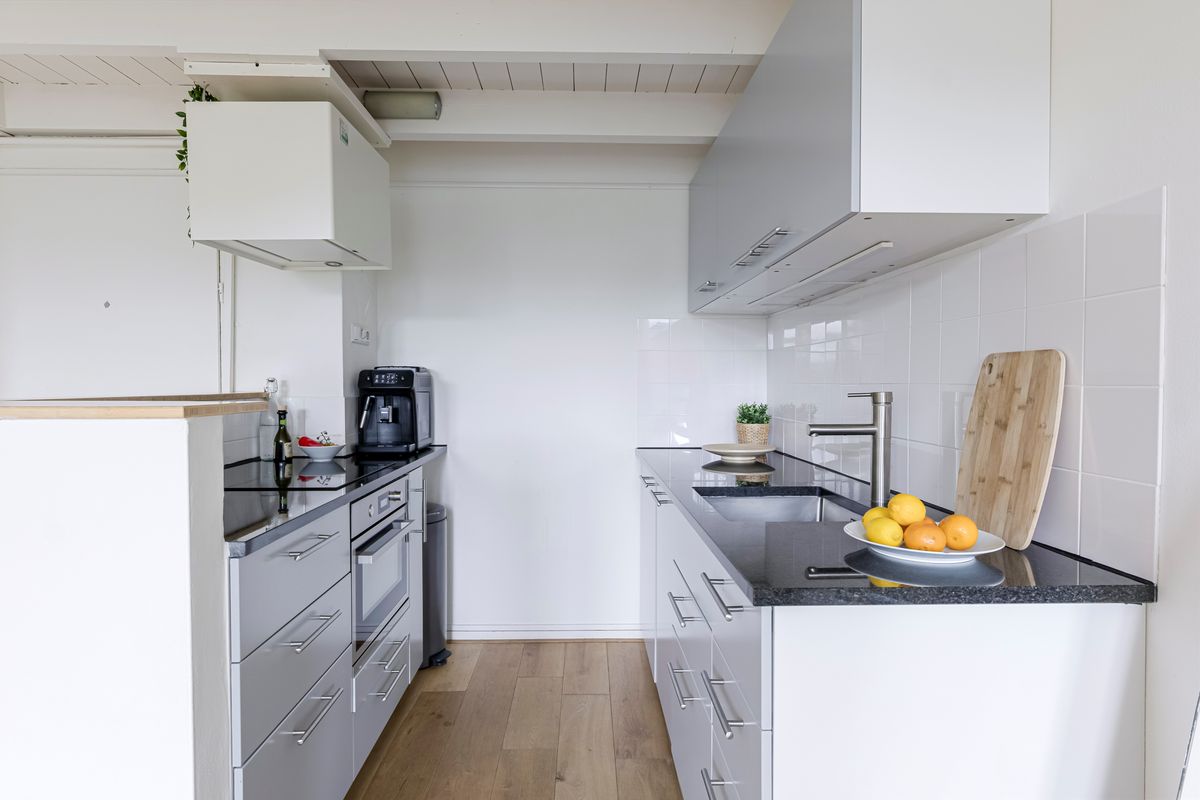 Vanuit de hal stap je direct de keuken in. Aan de rechterkant onder de trap is ruimte voor een kapstok en opslag. Ook zit hier de meterkast. Links de moderne open keuken. Er is inbouwapparatuur zoals een koelkast met vriesvak, vaatwasser, oven, inductie kookplaat met afzuigkap, De lichte woonkamer heeft grote raampartijen met zonnescherm en een open vide die zorgt voor extra ruimtelijkheid. De plafondhoogte is hier maar liefst 4,58 m2. Er ligt hier een mooie vloer met eiken toplaag.
