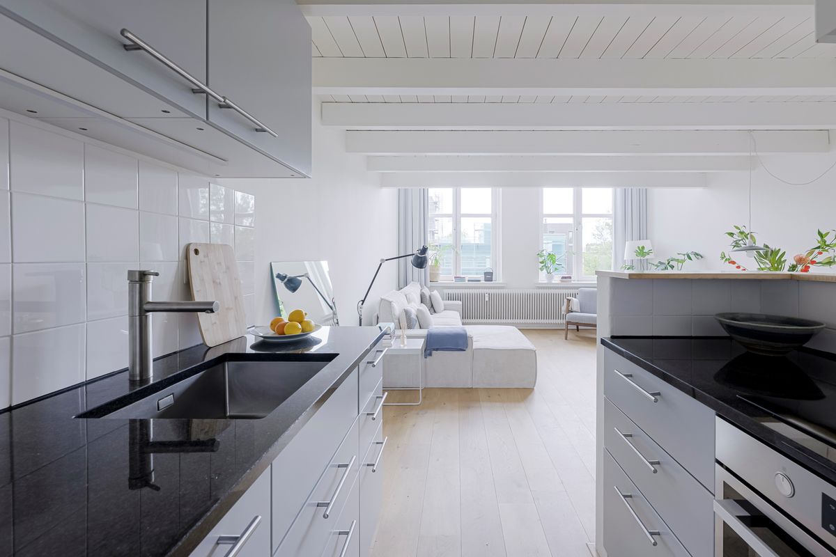 A staircase next to the apartment leads directly to the roof terrace. This extraordinary, expansive space is lovingly maintained by fellow residents and offers a variety of seating areas, sun loungers, a stone barbecue and even gym equipment such as a boxing bag. The panoramic views take in the Singelgracht, the Entrepotdok warehouses, the Maritime Museum and the towers of Central Station.