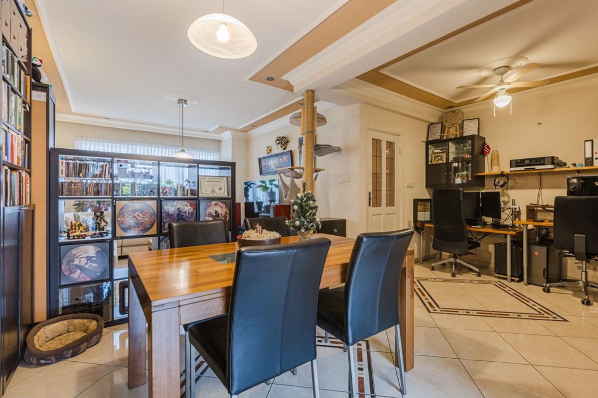 De woonkamer is licht en ruim opgezet en vormt een fijne plek voor zowel een gezellige zithoek als een royale eettafel. Aan de achterzijde is de woning uitgebouwd, waardoor een halfopen keuken is ontstaan die veel meer ruimte biedt dan gebruikelijk in dit type woning. De keuken is ingericht met diverse inbouwapparatuur en heeft een lichtkoepel en schuifpui naar de tuin. De begane grond is voorzien van vloerverwarming, wat zorgt voor een comfortabel woonklimaat.