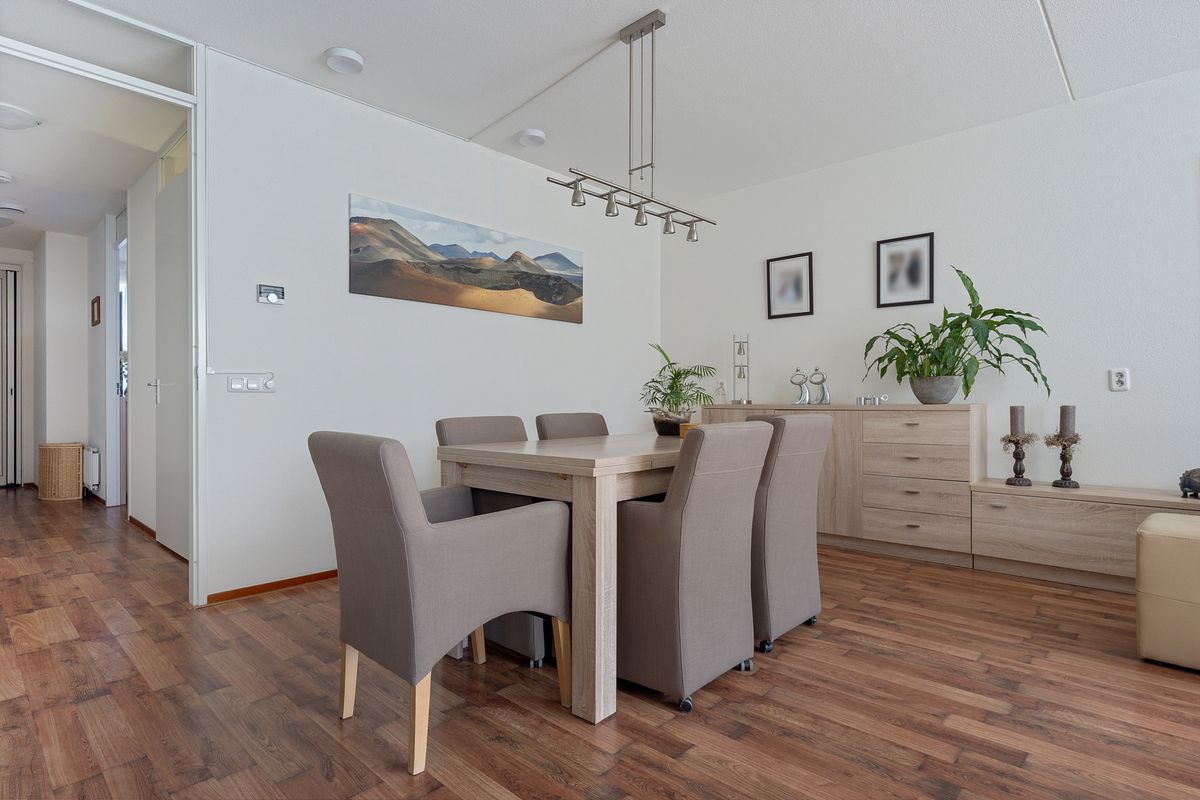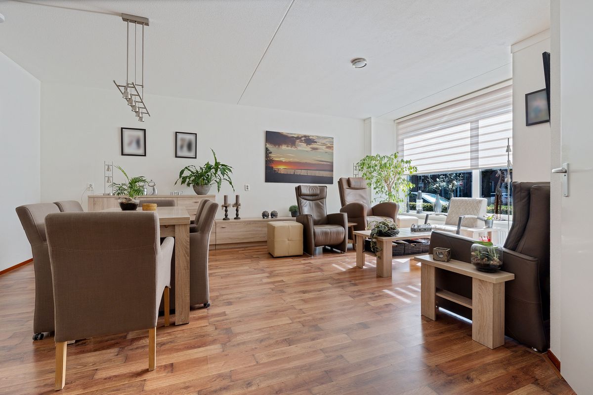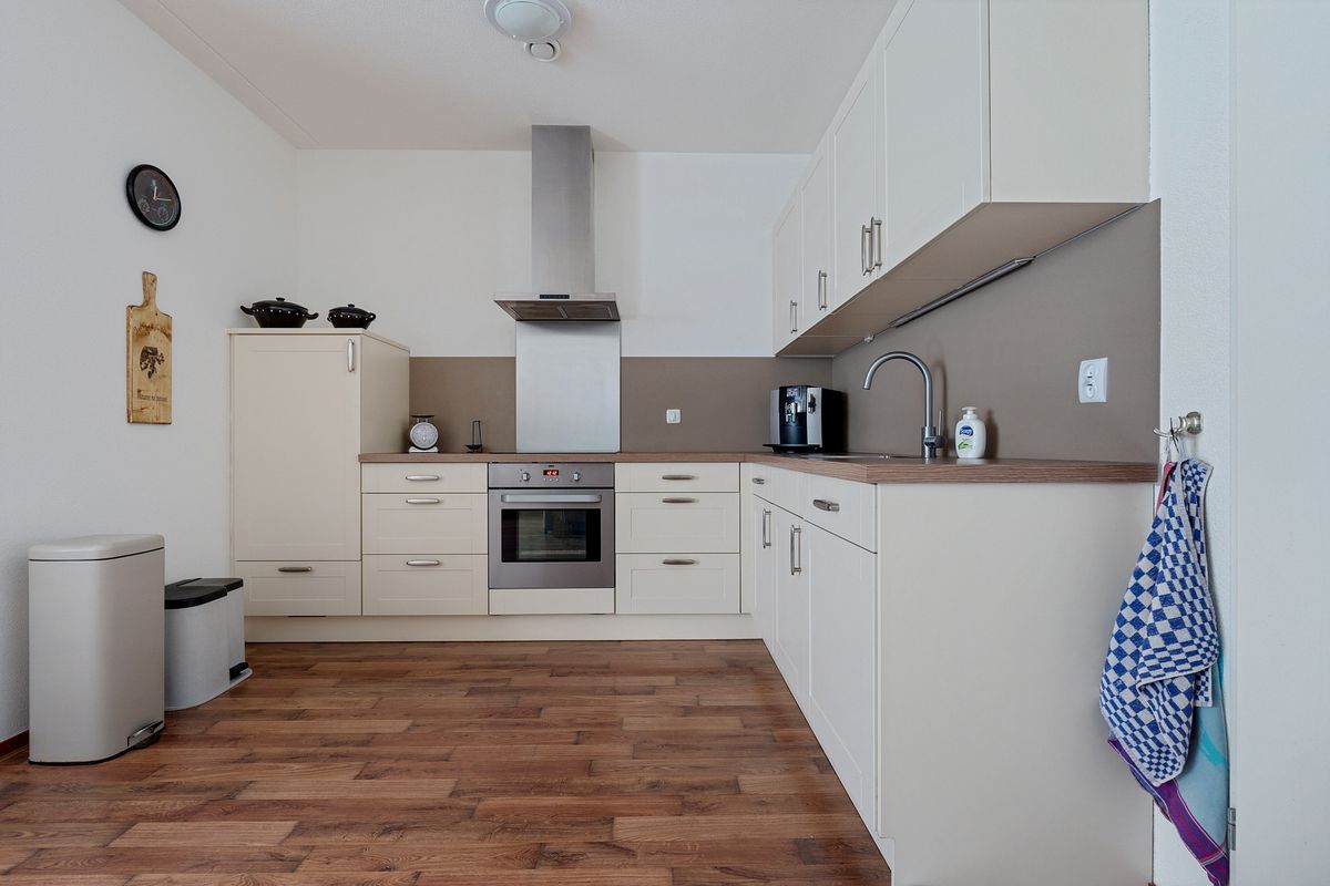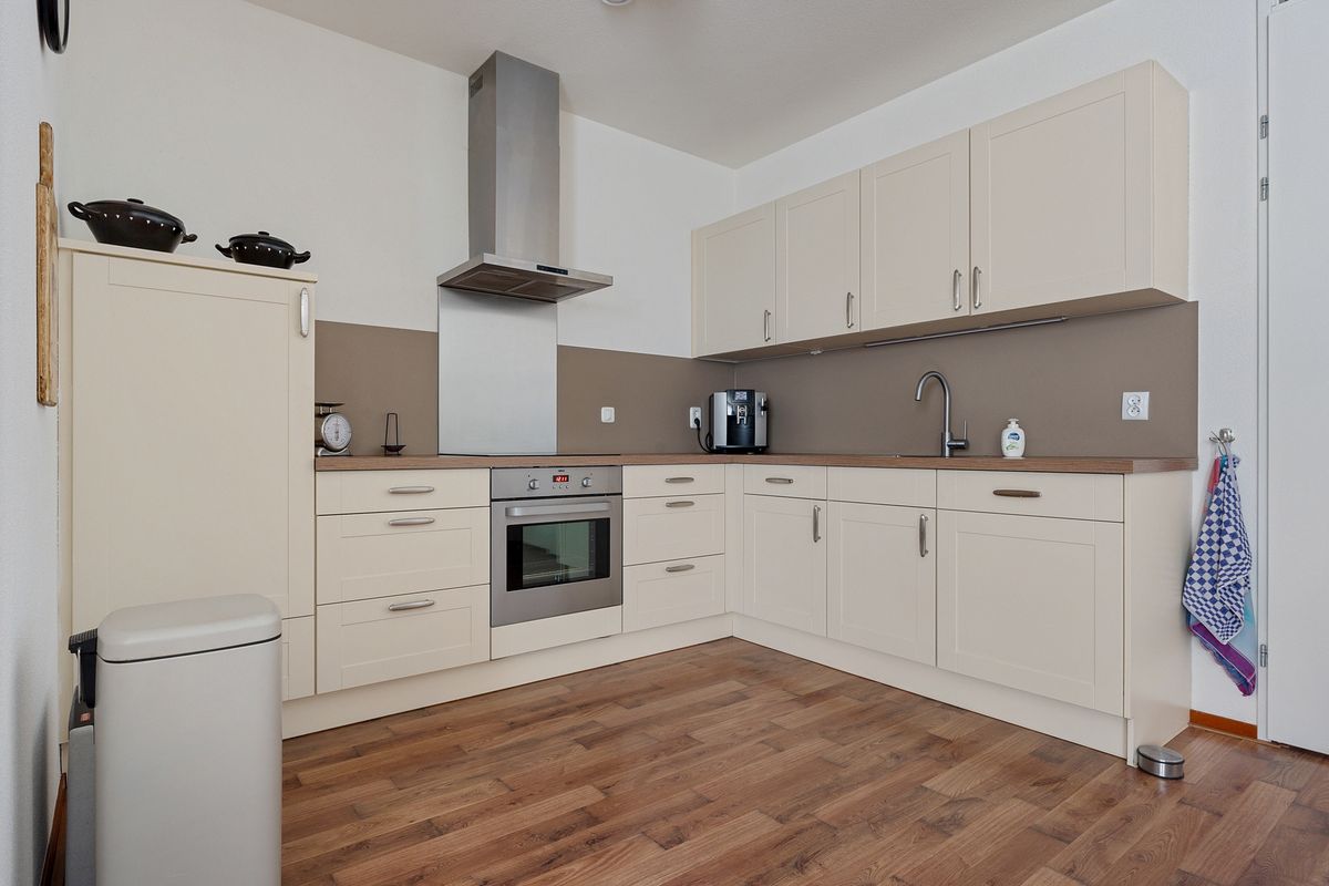Ruime woonkamer met plek voor zit- én eethoek, in open verbinding met de keuken. De keuken is compleet uitgerust met o.a. een ingebouwde oven, koelkast, inductiekookplaat (2019) en afzuigkap (2020).
