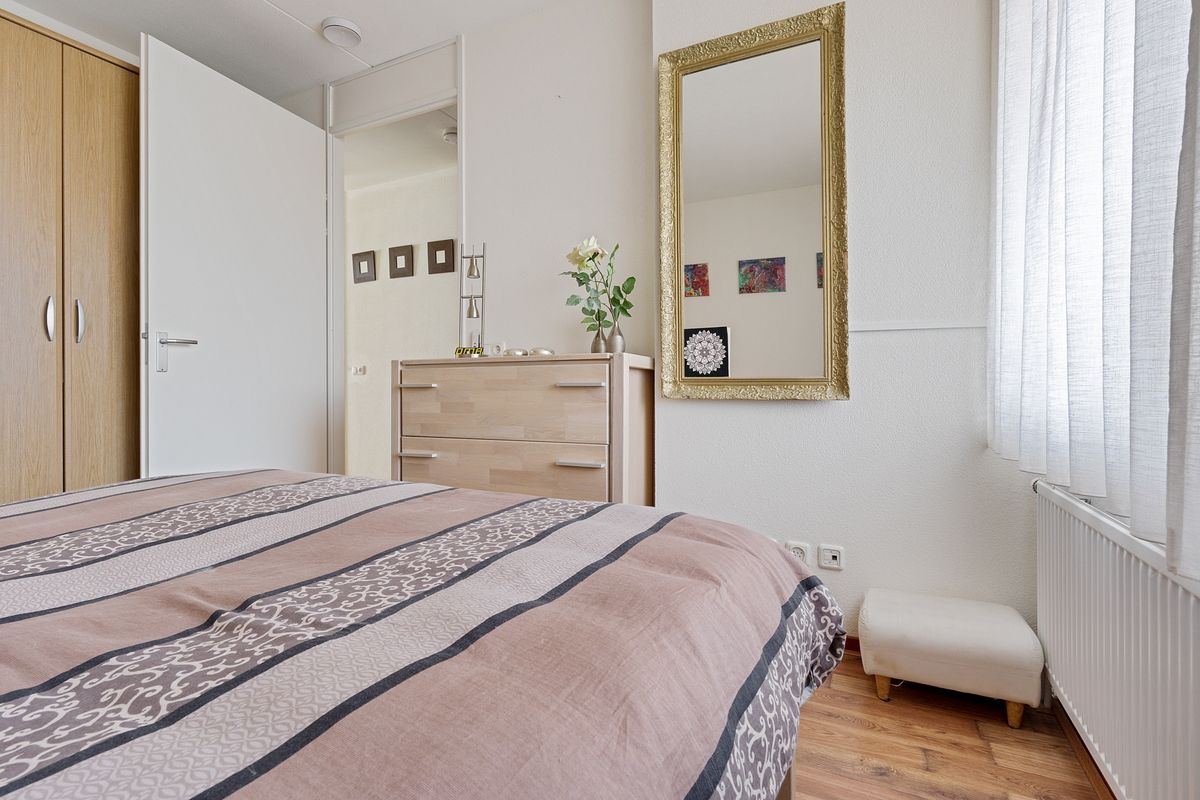 Achterin liggen twee slaapkamers: rechts de ruime masterbedroom, links een tweede, kleinere kamer. Beiden aan de rustige achterzijde. Vanuit de hal loopt u via de achterdeur naar het privéterras.