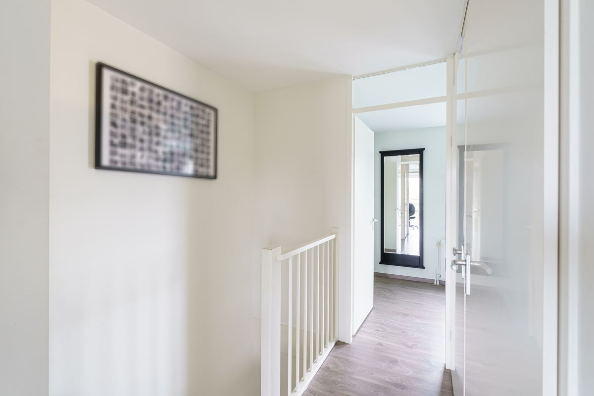 De trapopgang is afgesloten door mooie glazen schuifdeuren en zo kom je uit in de royale woon-/eetkamer. Veel lichtinval door de grote ramen met daarachter het balkon van bijna 7 m² met uitzicht op het groen en het water. Aan de voorzijde vind je de moderne keuken, een warme kleur keuken met houtkleuring aanrechtblad en natuurlijk alle soorten van inbouwapparatuur.