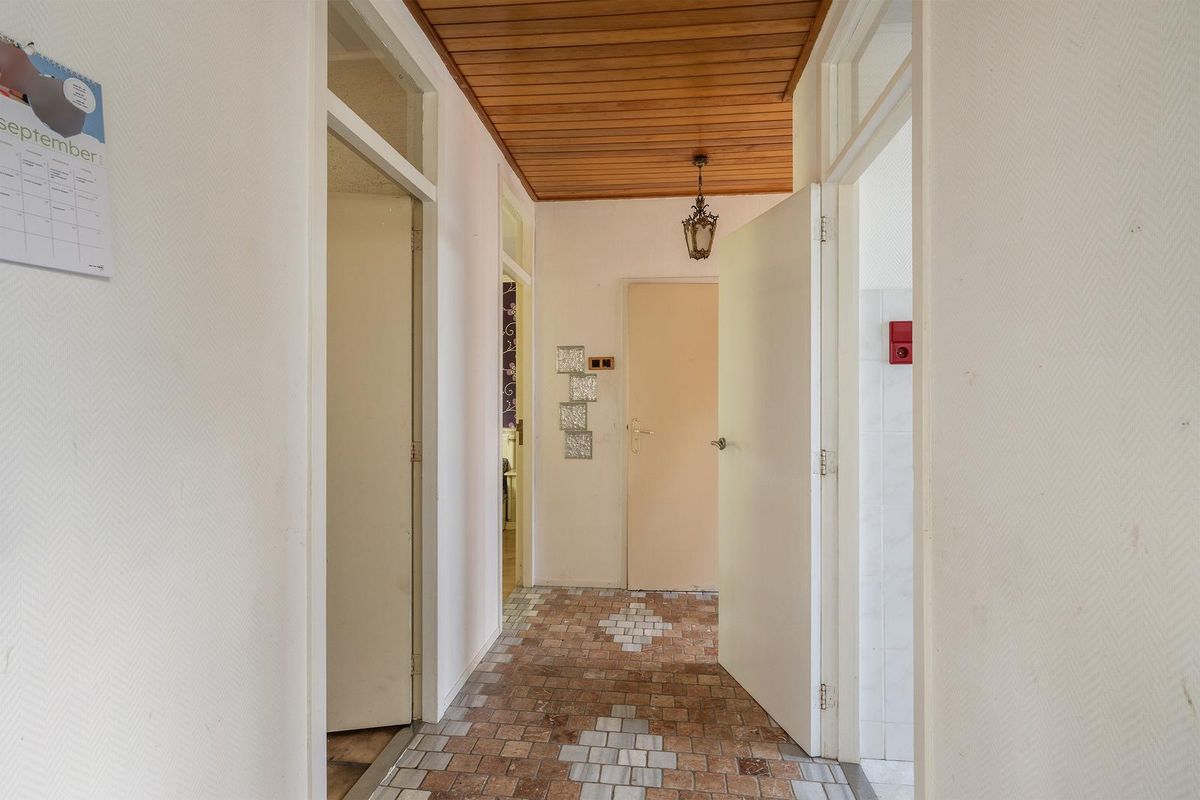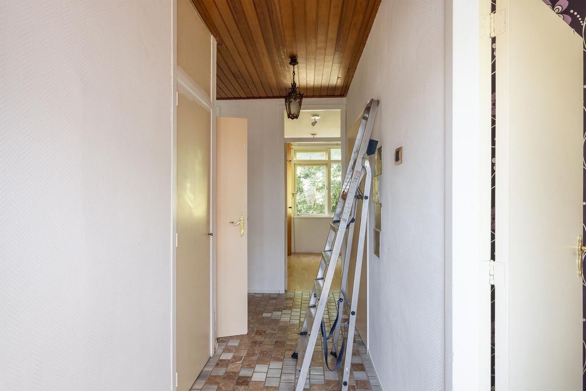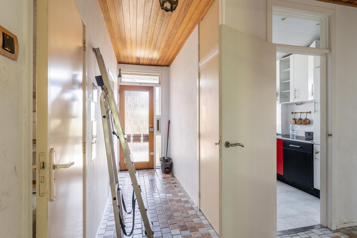 Hal/entree met de meterkast/stookruimte (5 groepen en de CV-combiketel) en toegang tot de woonkamer, keuken, bijkeuken, 2 slaapkamers en de badkamer.