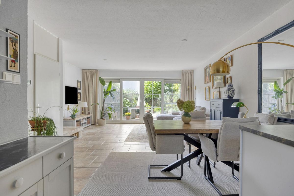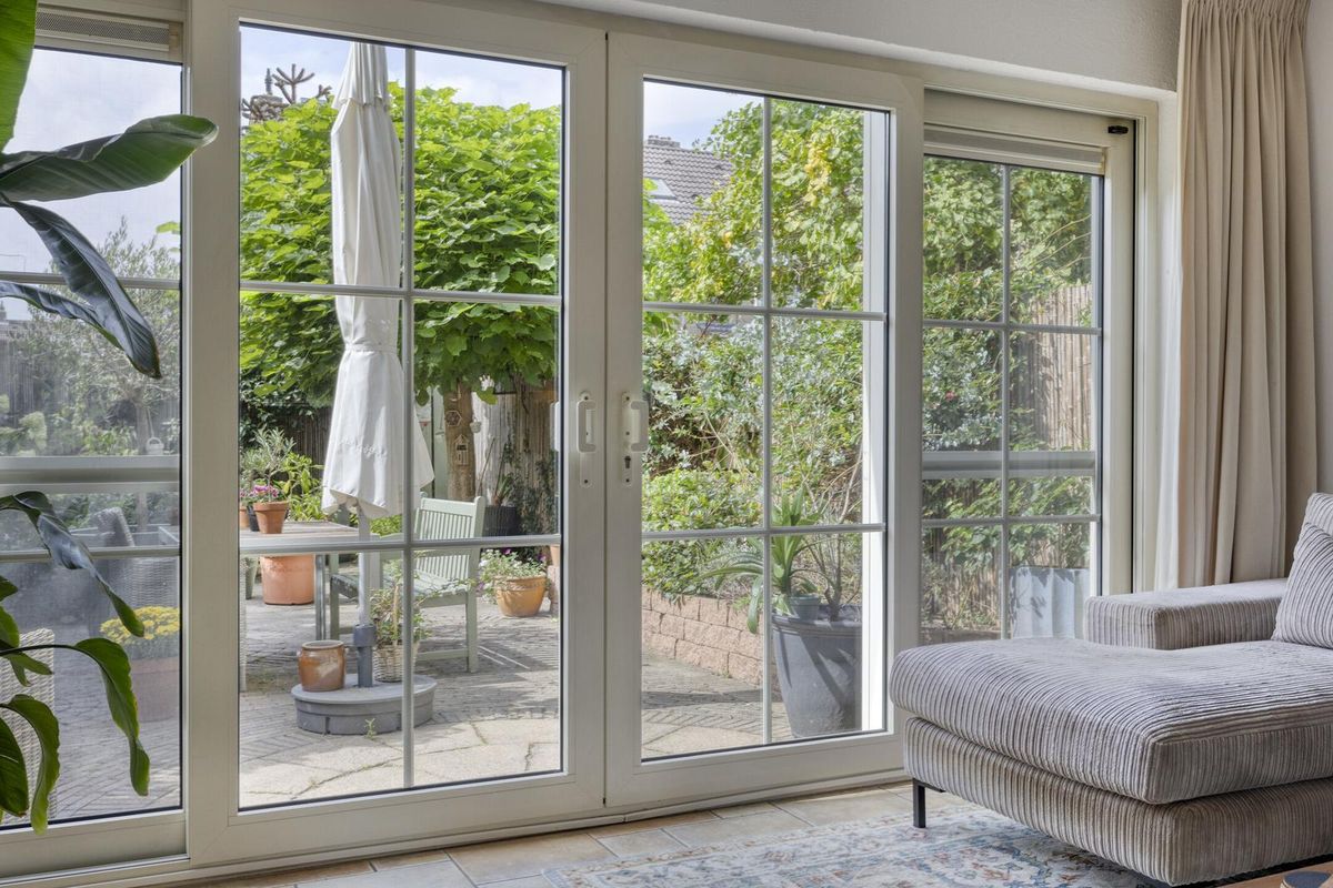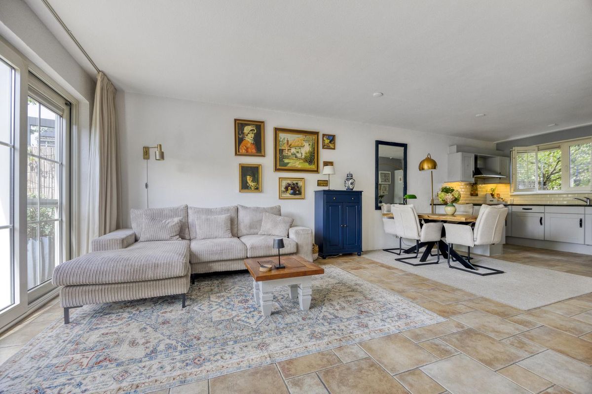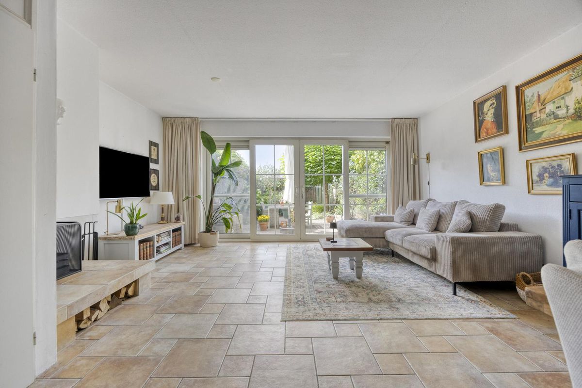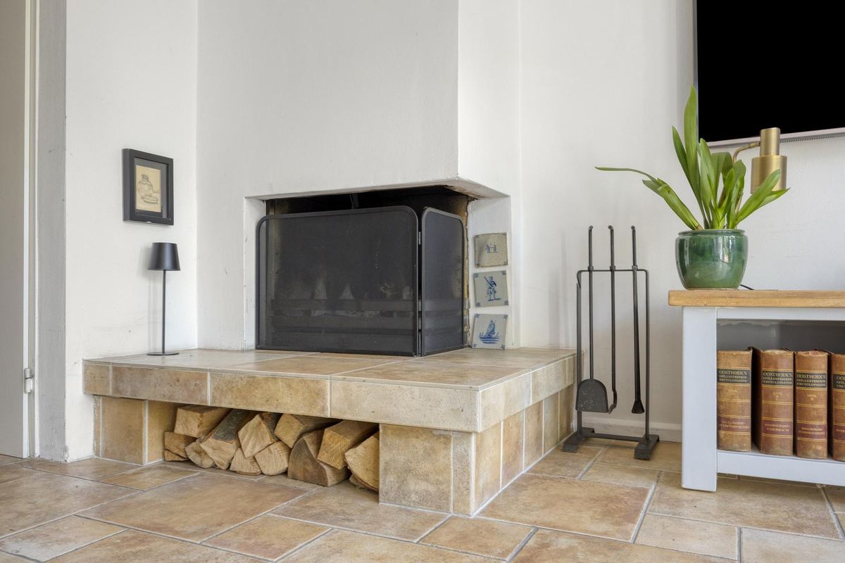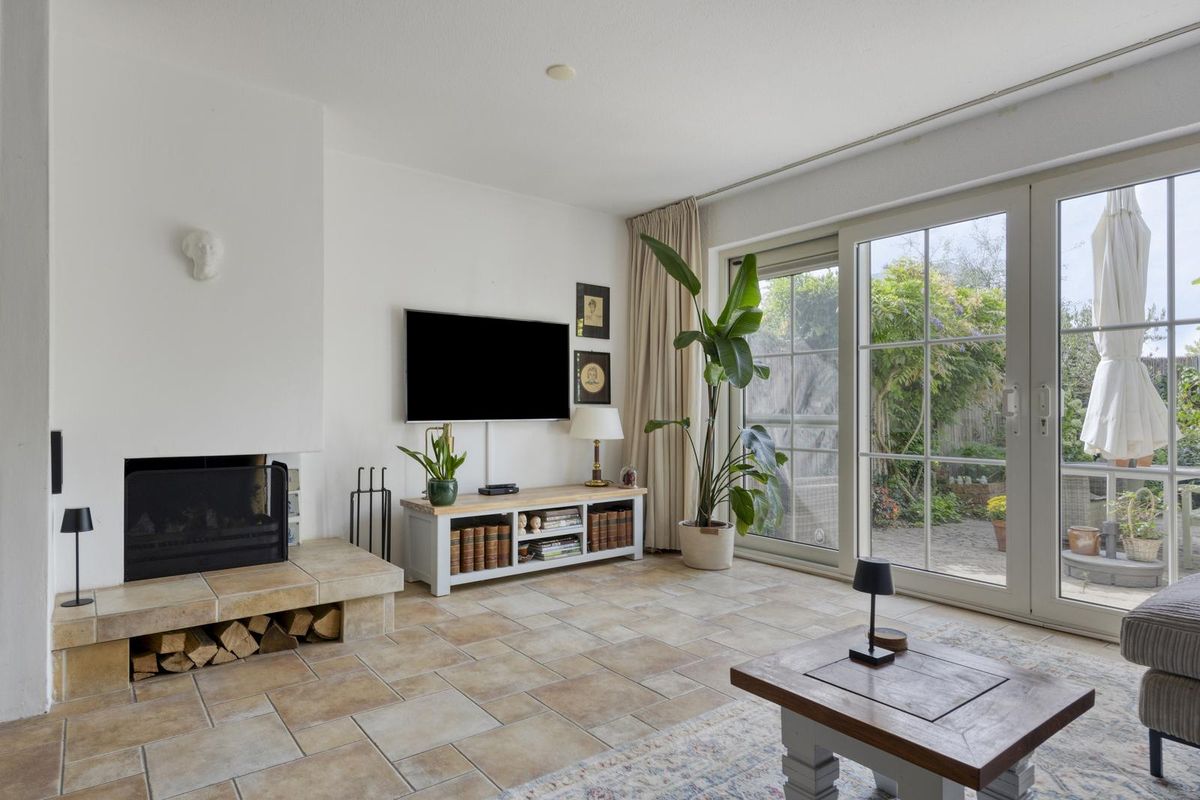 * Woonkamer met trapkast, openhaard en schuifpui naar achtertuin;