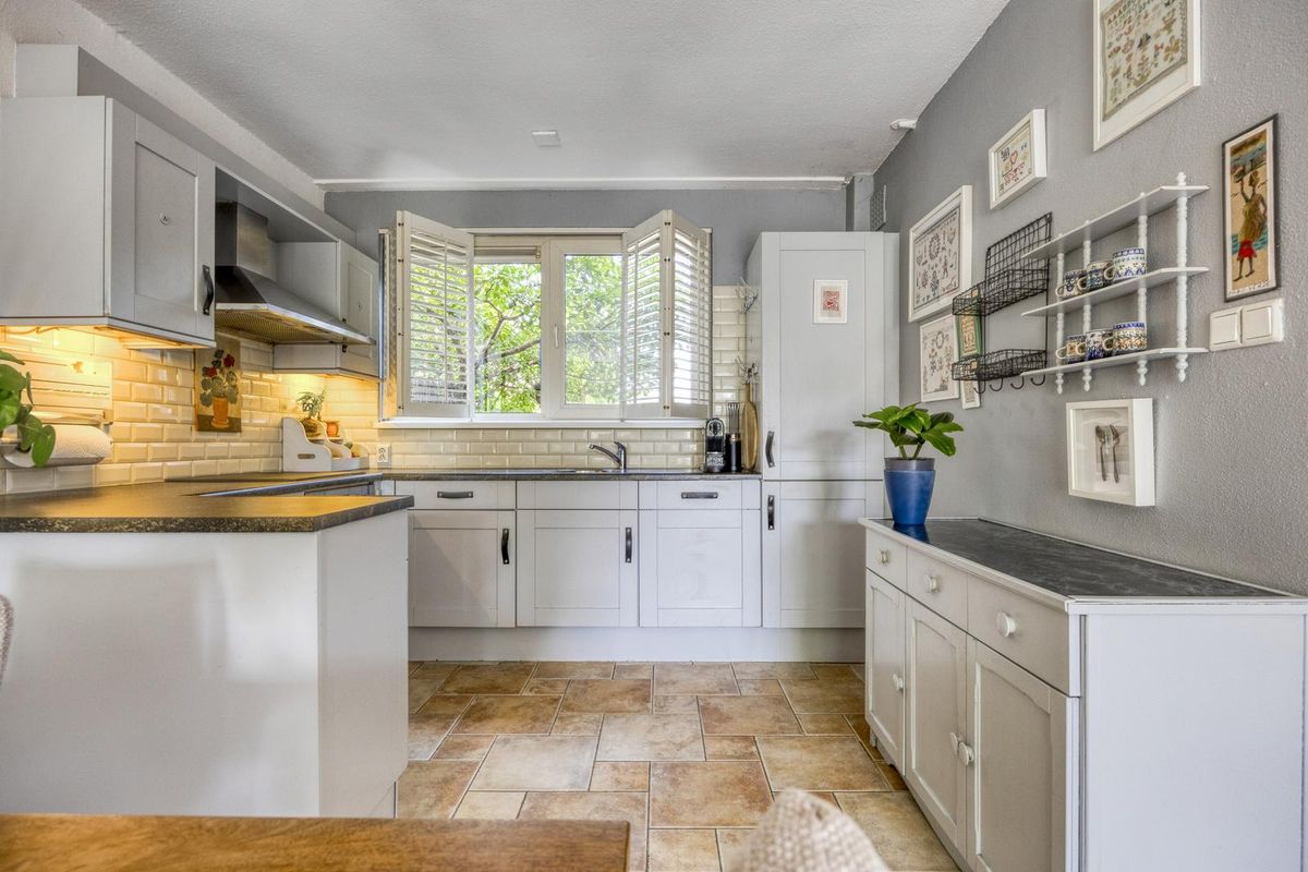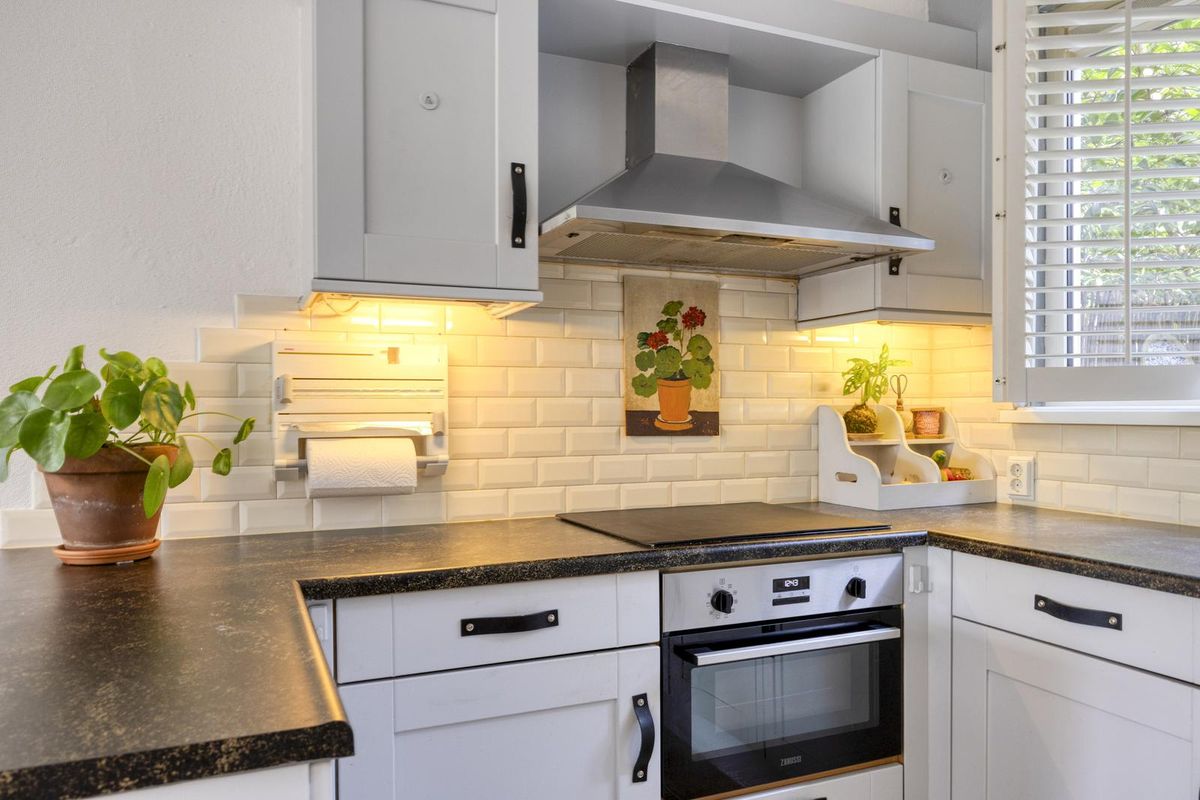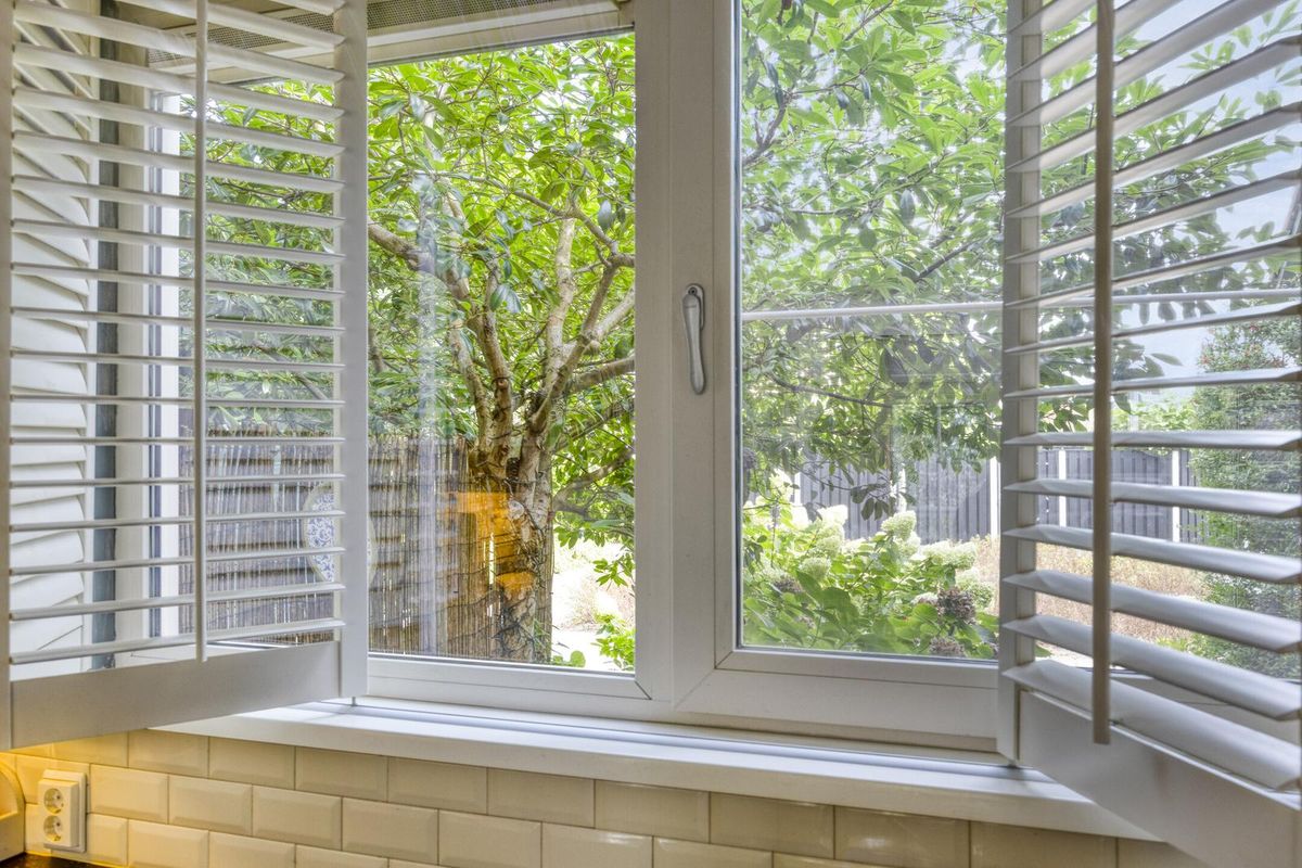 * Open keuken in lichte kleurstelling, voorzien van een inductie kookplaat, RVSafzuigkap, combi-oven, vaatwasser en koel-/vriescombinatie. Het keukenraam is voorzien van shutters.