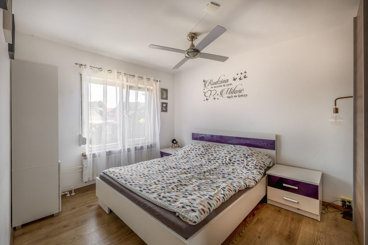 De overloop biedt toegang tot drie slaapkamers (ca. 7,5m², 10m² en 11,5m²), allemaal voorzien van laminaatvloeren. De badkamer is compact maar praktisch en uitgerust met een douche en wastafelmeubel.