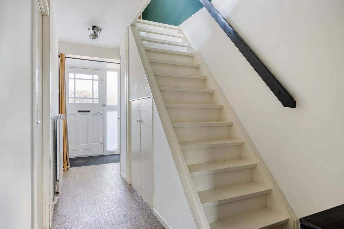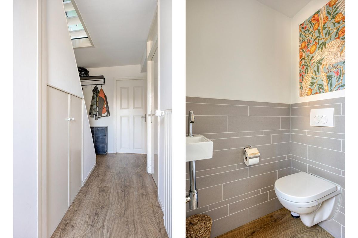 Via de ruime voortuin met parkeergelegenheid op eigen terrein, bereik je de entree van de woning. In de hal bevinden zich de meterkast, het toilet, de toegang tot de royale inpandige garage en de trapopgang naar de eerste verdieping.