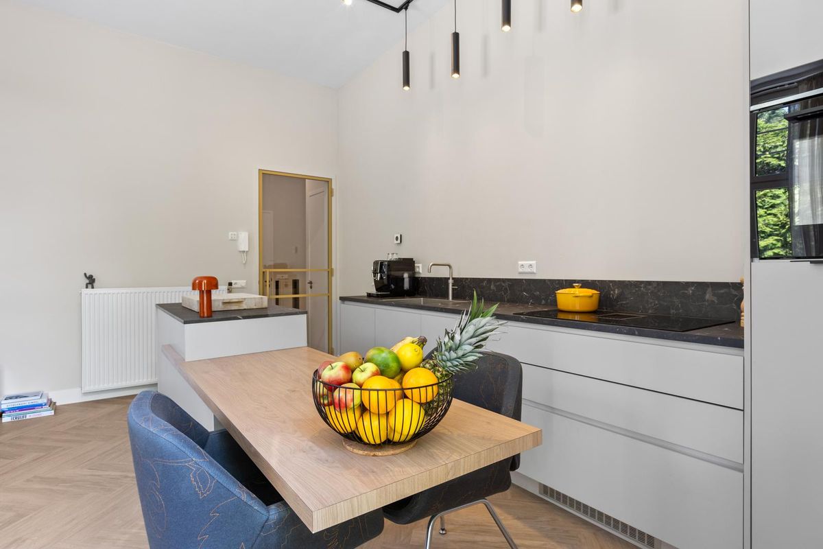 Je komt binnen via de hal en meteen valt de hoogte op, wat zorgt voor een ruimtelijk gevoel. Vanuit hier stap je de living in met zithoek, open keuken en eetgedeelte. Alles is strak en modern afgewerkt met oog voor detail en een prachtige visgraatvloer. De zithoek is de perfecte plek om te relaxen na een drukke dag of lekker een serie te kijken. De keuken is in 2023 geplaatst en ziet er top uit! Het kookeiland biedt extra werk- en bergruimte en loopt slim door in een eettafel waar je gezellig kunt aanschuiven. Alle apparatuur (SMEG) is nog bijna nieuw. Denk aan een inductiekookplaat met geïntegreerde afzuiging, een combi-oven, vaatwasser, koelkast en een quooker. Dankzij de openslaande deuren geniet je van veel lichtinval en de prachtige, eigen tuin met schitterend uitzicht. De buitenruimte is ronduit heerlijk en gunstig qua zon en uitzicht. In de hal vind je ook nog het moderne toilet met marmerlook achterwand, sfeerverlichting en natuurlijk de meterkast.
