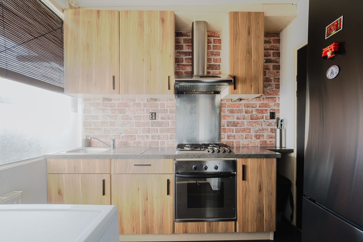 De keuken bevindt zich aan de voorzijde van het appartement en is voorzien van inbouwapparatuur, een wasmachineaansluiting en bergruimte waar ook plek is voor een droger en de cv-installatie.