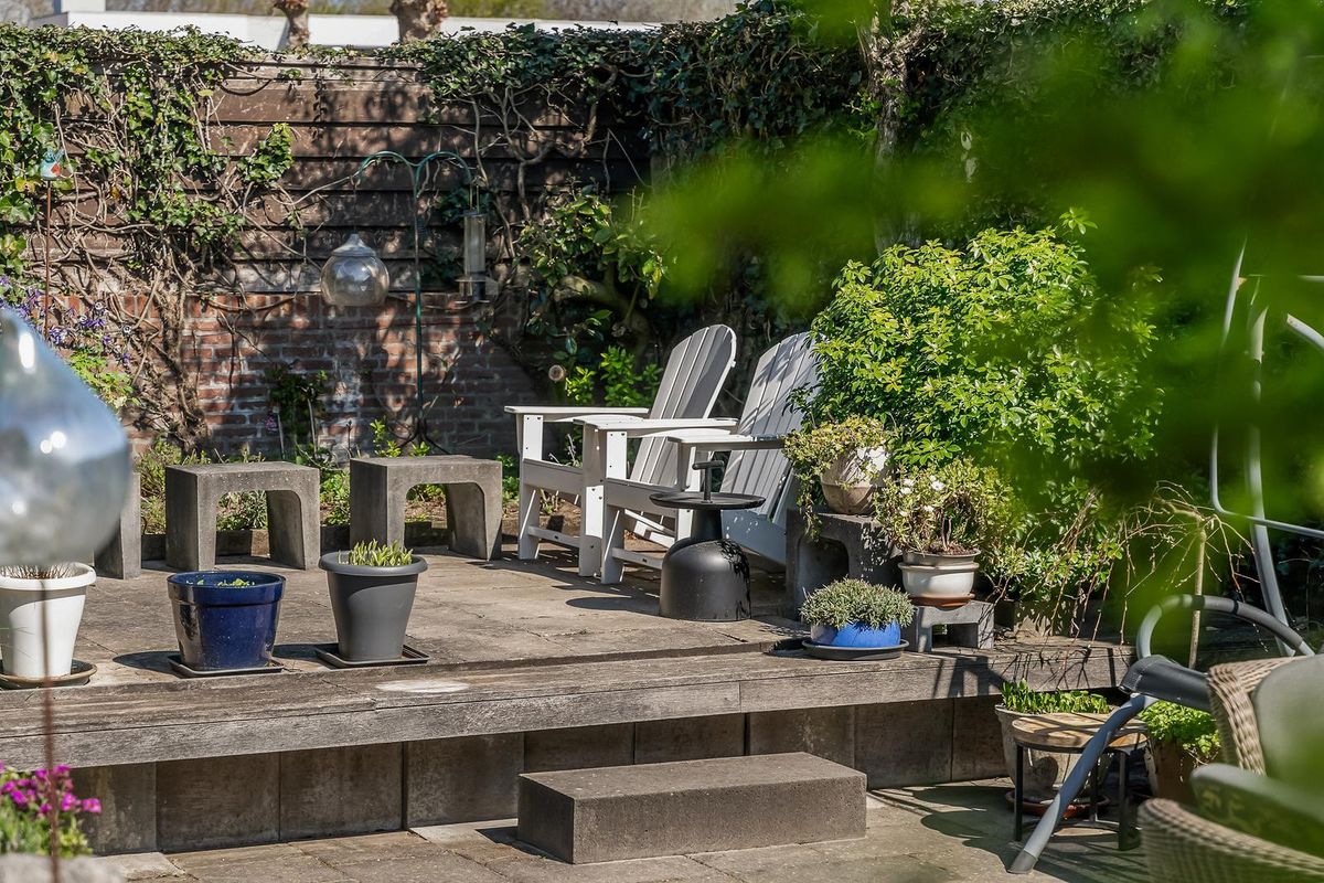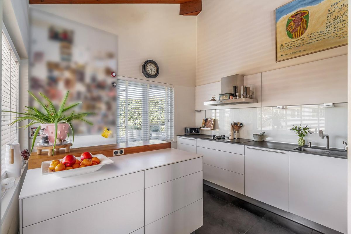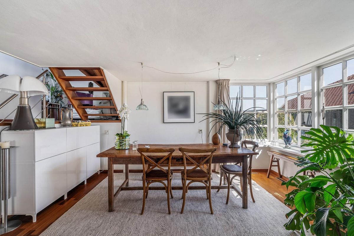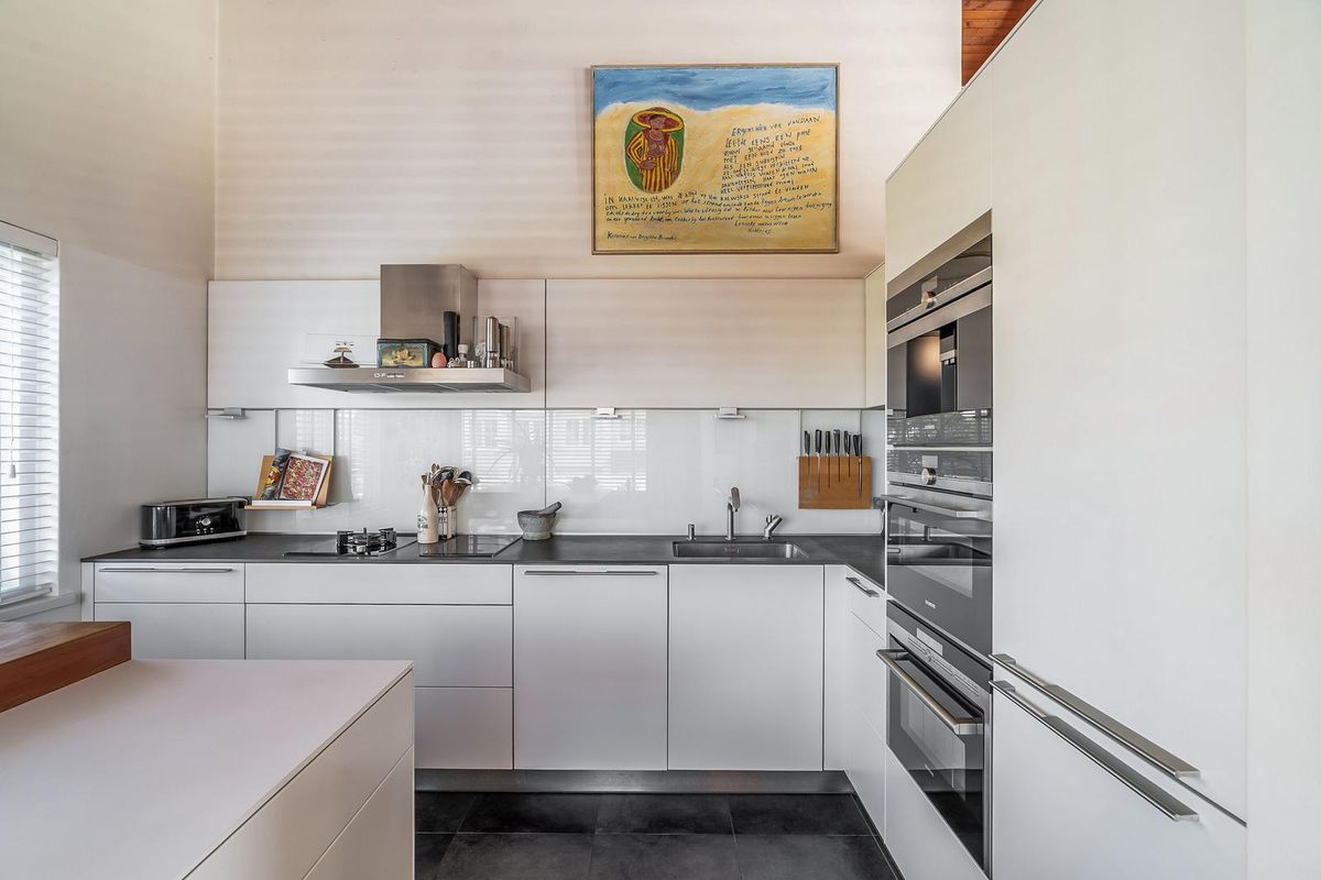 De entree ligt op de eerste verdieping en geeft toegang tot een ruime hal met garderobe, toilet en meterkast. De lichte woonkamer is sfeervol vormgegeven met een eikenhouten vloer, een gashaard en grote schuifpui naar het zonnige terras. De keuken sluit halfopen aan op de living en is uitgerust met hoogwaardige inbouwapparatuur, waaronder een Quooker, Siemens kookplaten (gas en inductie), oven, magnetron, ingebouwde koffiemachine en een vaatwasser.
