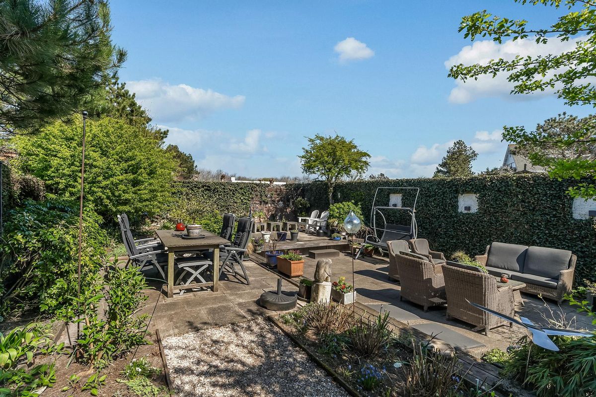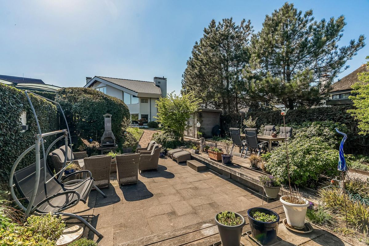 Rondom de villa ligt een prachtig aangelegde duintuin met hoogteverschillen, volwassen groen en meerdere terrassen. Hierdoor is op elk moment van de dag een beschut of zonnig plekje te vinden. Aan de voorzijde ligt een brede oprit met parkeergelegenheid voor twee auto’s. Via de achterzijde is het eenvoudig rond de woning te lopen naar zowel de keuken als de woonkamer. In de tuin staat tevens een houten berging.