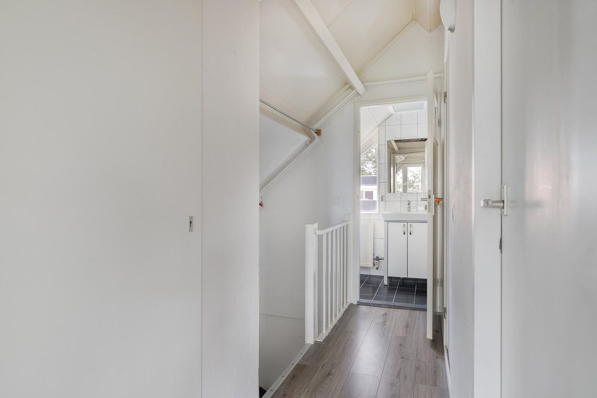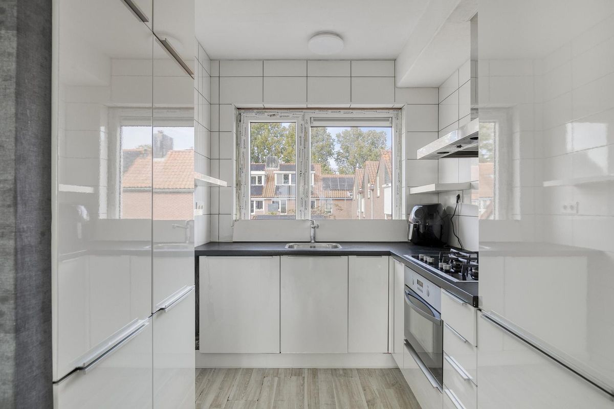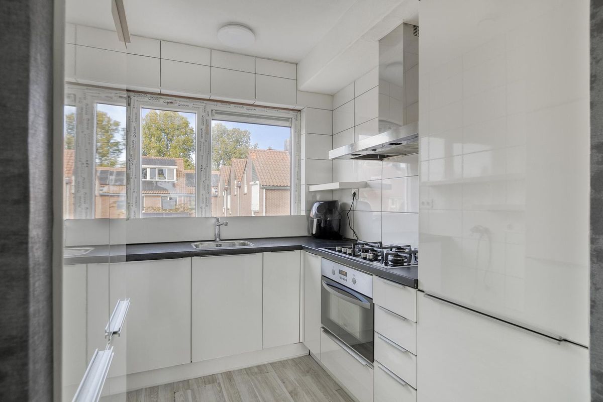 Aangekomen op de eerste verdieping vind je eerst de overloop met toiletruimte. Daarna volgt de gezellige en lichte woonkamer met toegang tot het zonnige balkon met vrij uitzicht. Aan de voorzijde treffen we de nette keuken aan. Deze is ingericht in een moderne U-vorm. Als inbouwapparatuur heb je de beschikking over een vaatwasser, koel/vriescombinatie, spoelbak, oven en een gasfornuis met afzuigkap. Deze gehele verdieping is voorzien van een eigentijdse laminaatvloer.
