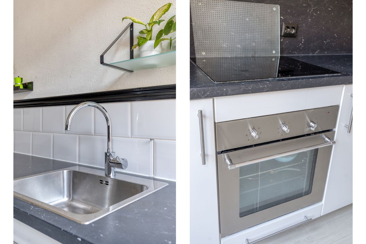 De keuken is praktisch ingericht en uitgerust met een inductiekookplaat, moderne zwarte afzuigkap, oven, vaatwasser en koel-/vriescombinatie. Ook vanuit de keuken heeft u directe toegang tot het balkon.
