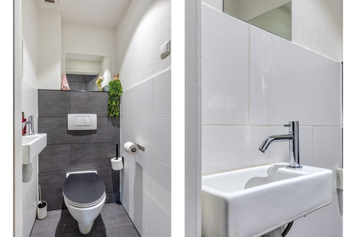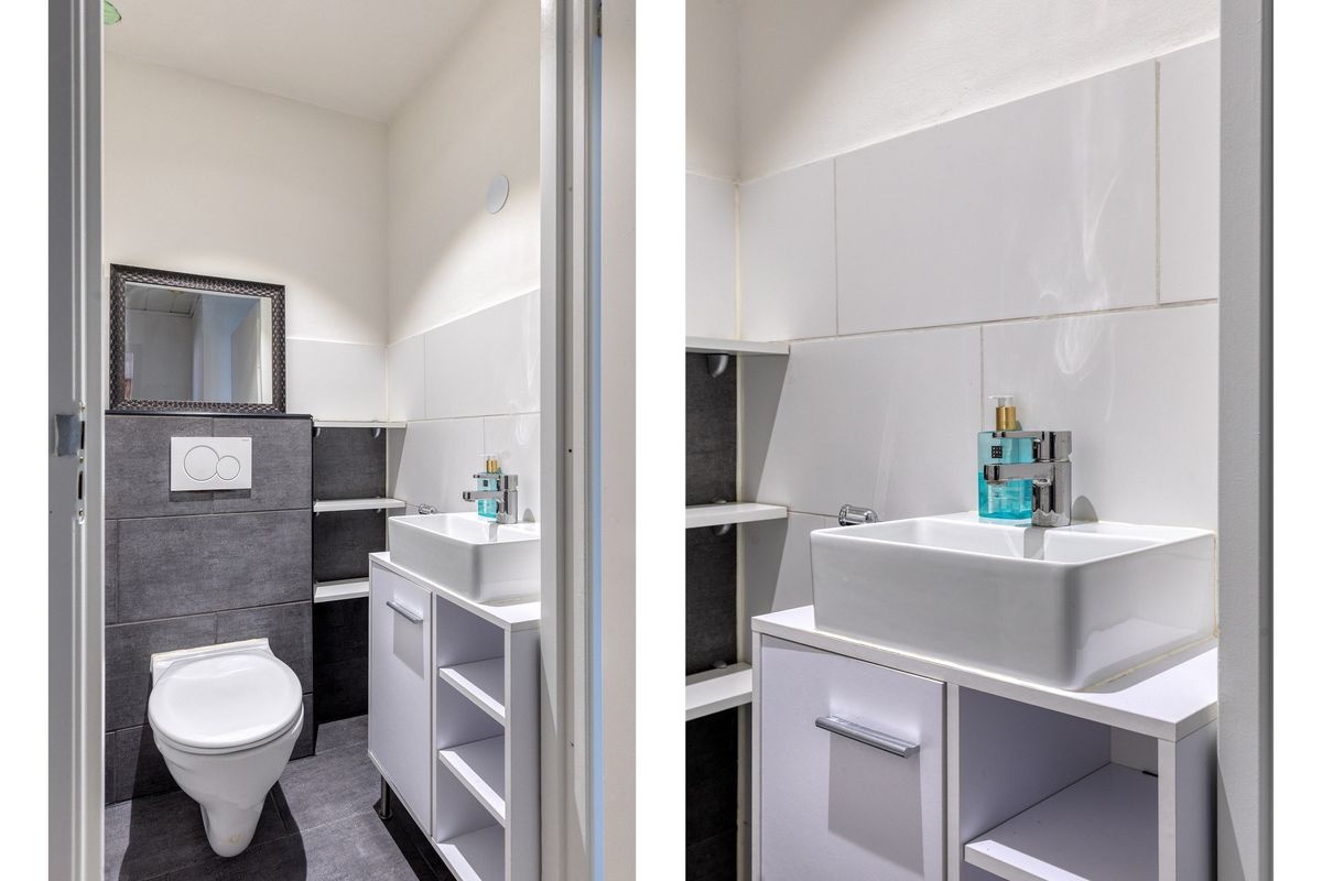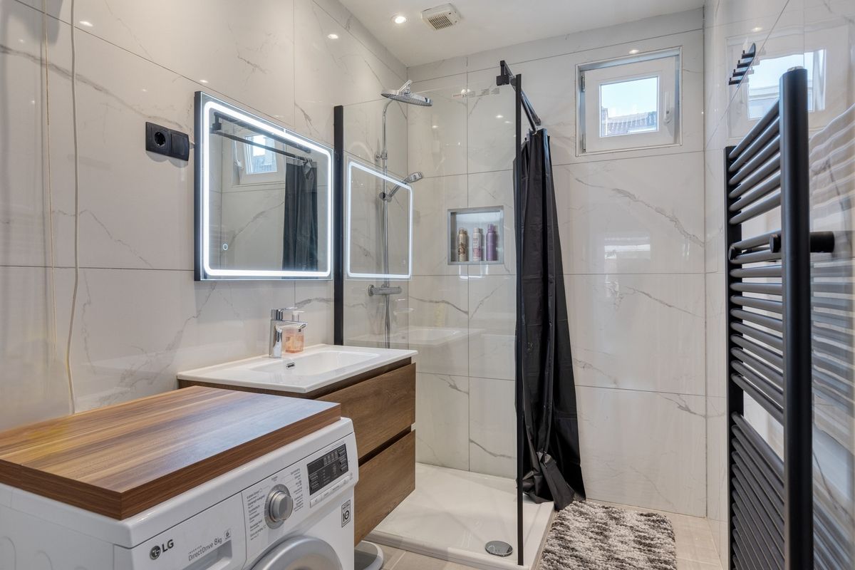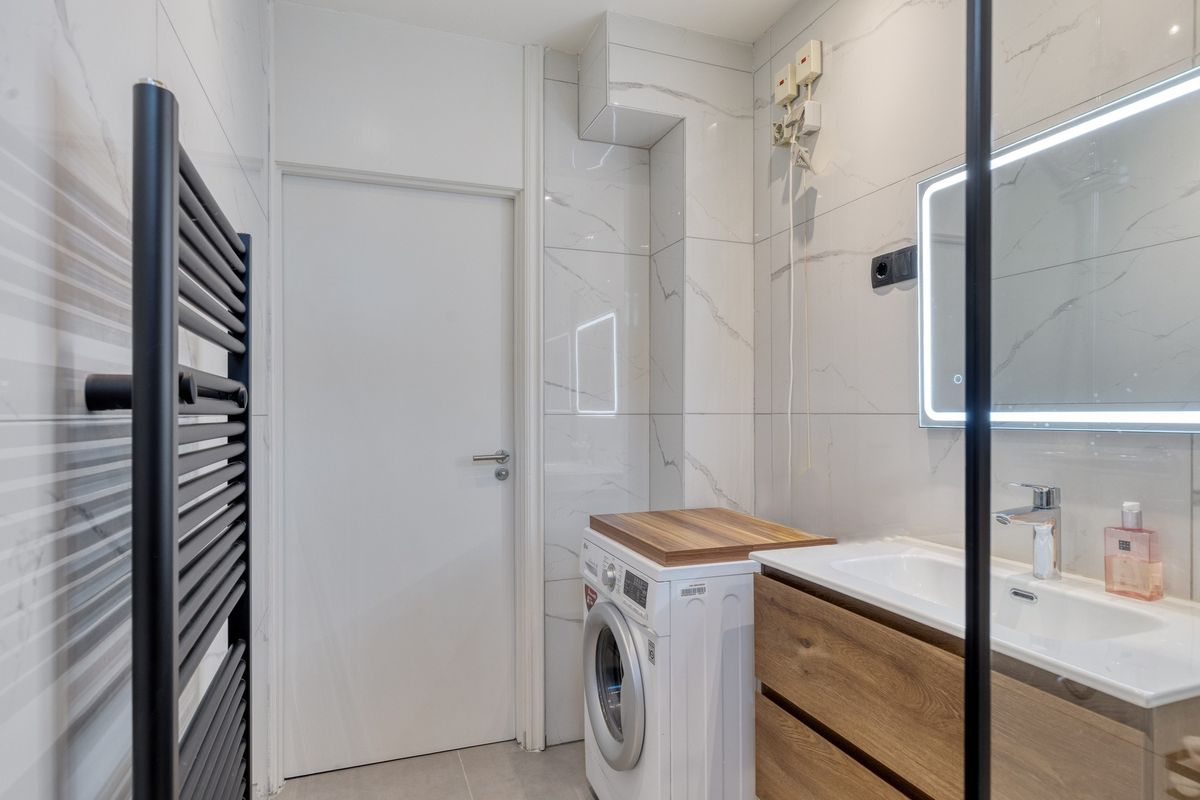 De vernieuwde tussengelegen badkamer beschikt over een inloopdouche, stijlvol wastafelmeubel, handdoekradiator en de opstelplaats voor de wasmachine. Daarnaast is er een separaat toilet met fonteintje.