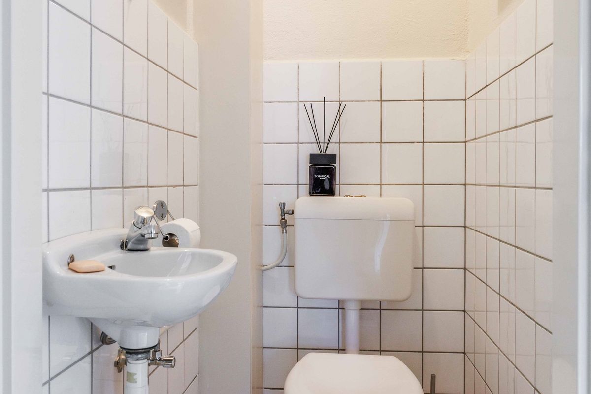 Begane grond: entree met hal, meterkast, toilet en trapopgang. De lichte woonkamer (ca. 32 m²) heeft een praktische provisiekast en een prettig uitzicht op de tuin. De dichte keuken (ca. 8 m²) sluit aan op de bijkeuken met achteringang – ideaal voor fietsen of extra opslagruimte.