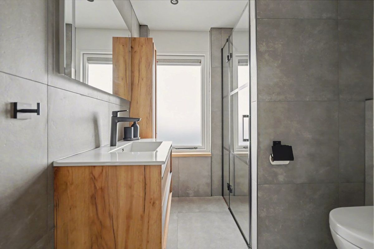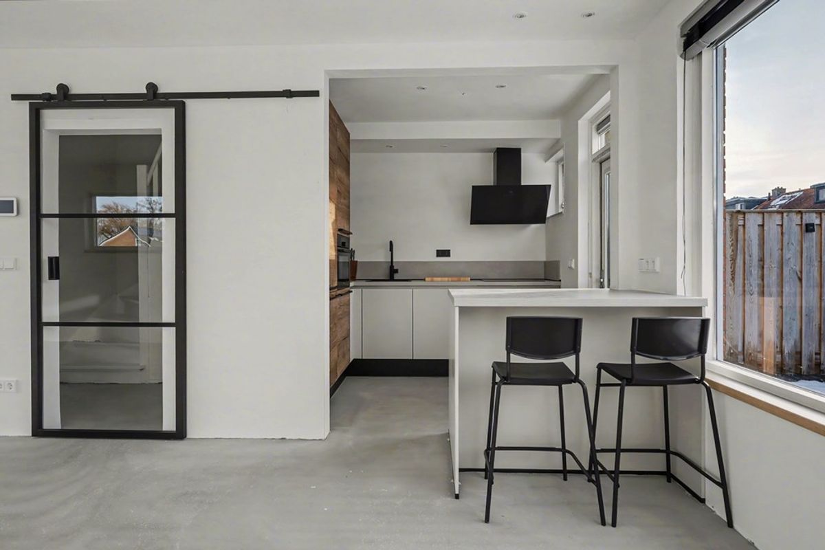 Wat is er zoal gedaan: het buitenschilderwerk werd uitgevoerd (dat was overigens nog in 2024), alle elektra, stopcontacten en de meterkast werden vernieuwd, de badkamer en het toilet werden vernieuwd, de muur tussen woonkamer en keuken werd verwijderd, er werd een nieuwe keuken geplaatst, de begane grondvloer werd voorzien van vloerverwarming, er werd een gave stalen schuifdeur aangebracht - op de muur tussen de woonkamer en de hal - en het dak en de kruipruimte werden nageïsoleerd. Dat zijn wel de grootste en duurste werkzaamheden geweest.