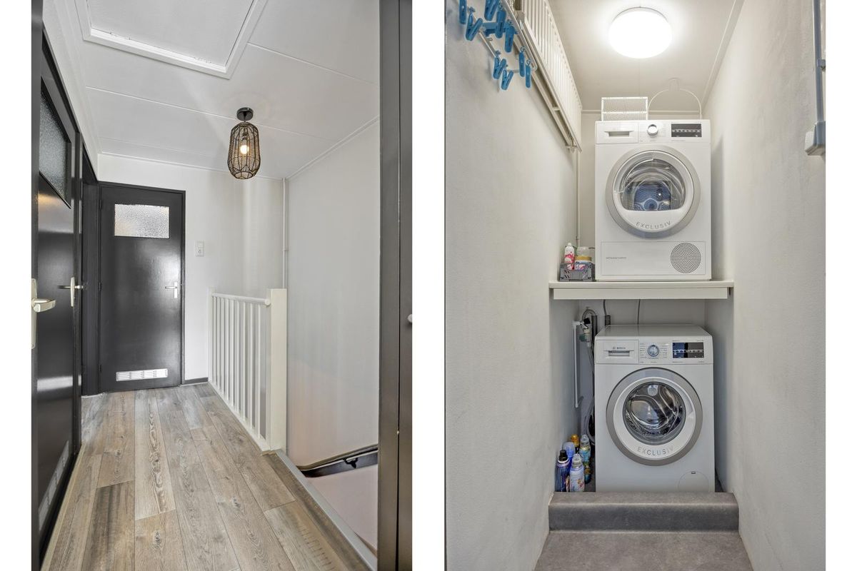 Naast de badkamer tref je een wasruimte, waar de wasmachine en droger een eigen plek hebben. Hierdoor blijft alle was netjes en overzichtelijk op één plek.