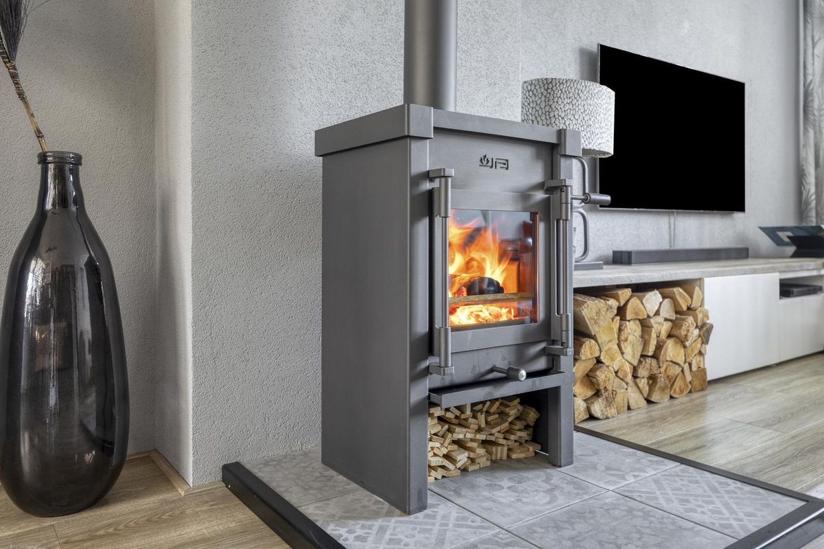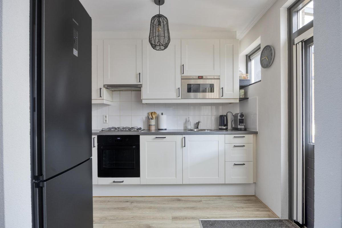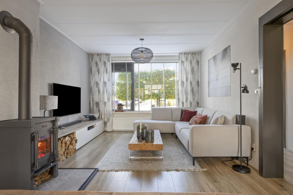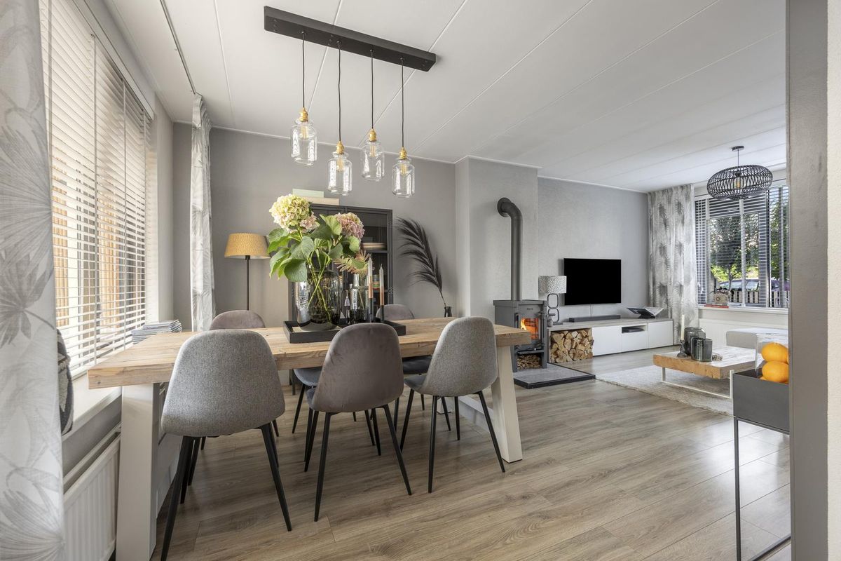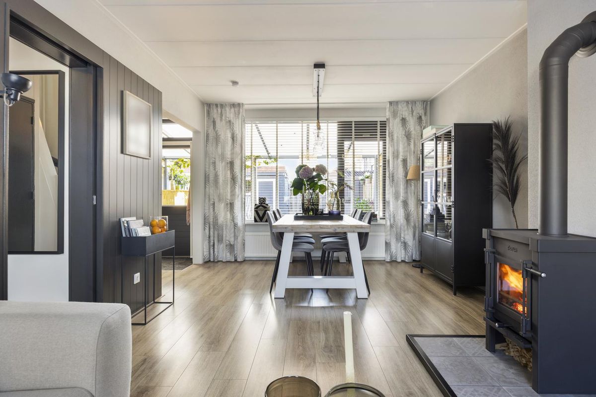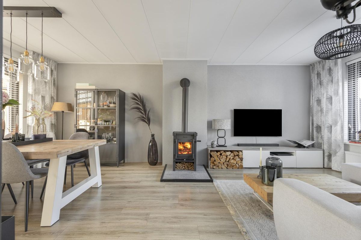 De woonkamer is licht en sfeervol, met aan de voorzijde een comfortabele zithoek bij de sfeervolle houtkachel en aan de achterzijde een eethoek met uitzicht op de gezellige veranda in de tuin. Vanuit de eethoek kijk je zo de open keuken in, wat zorgt voor een ruimtelijk gevoel en een fijne verbinding tussen deze ruimtes. De grote raampartijen zorgen voor prettig veel natuurlijk lichtinval. Met als raambekleding witte bamboe jaloezieën zodat je zelf kunt bepalen wanneer je het zonnetje in huis wilt laten schijnen of juist iets meer privacy wenst.