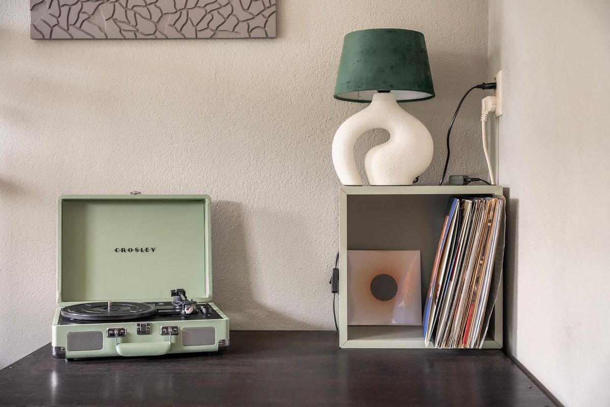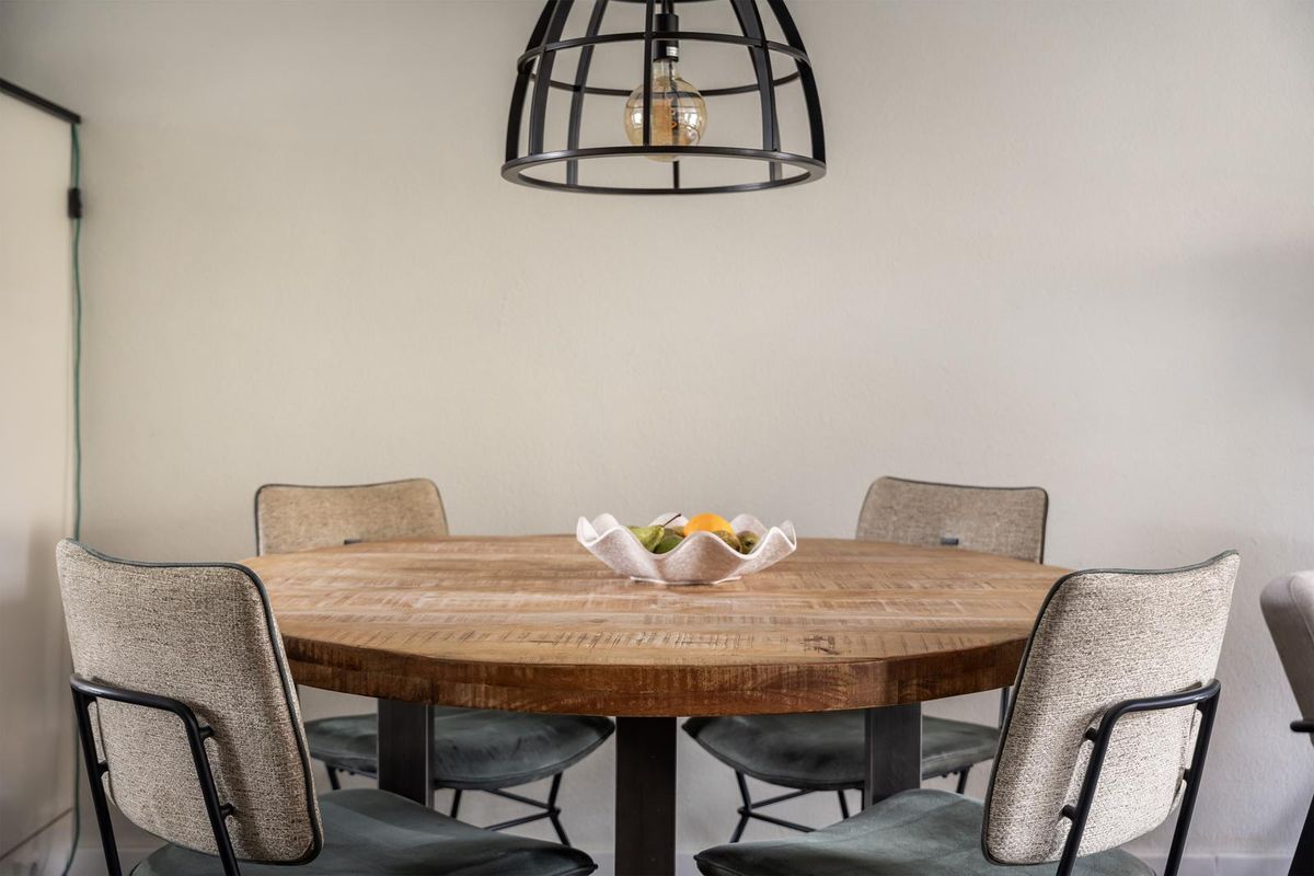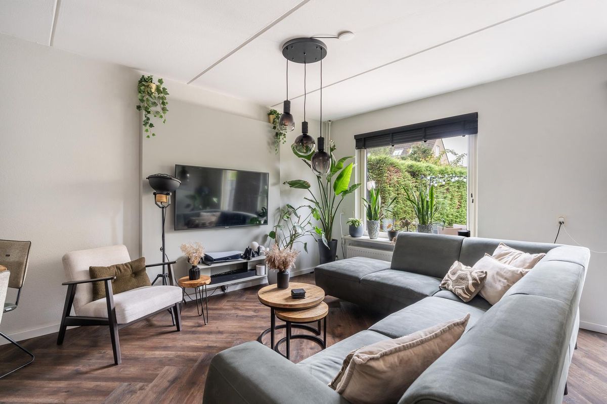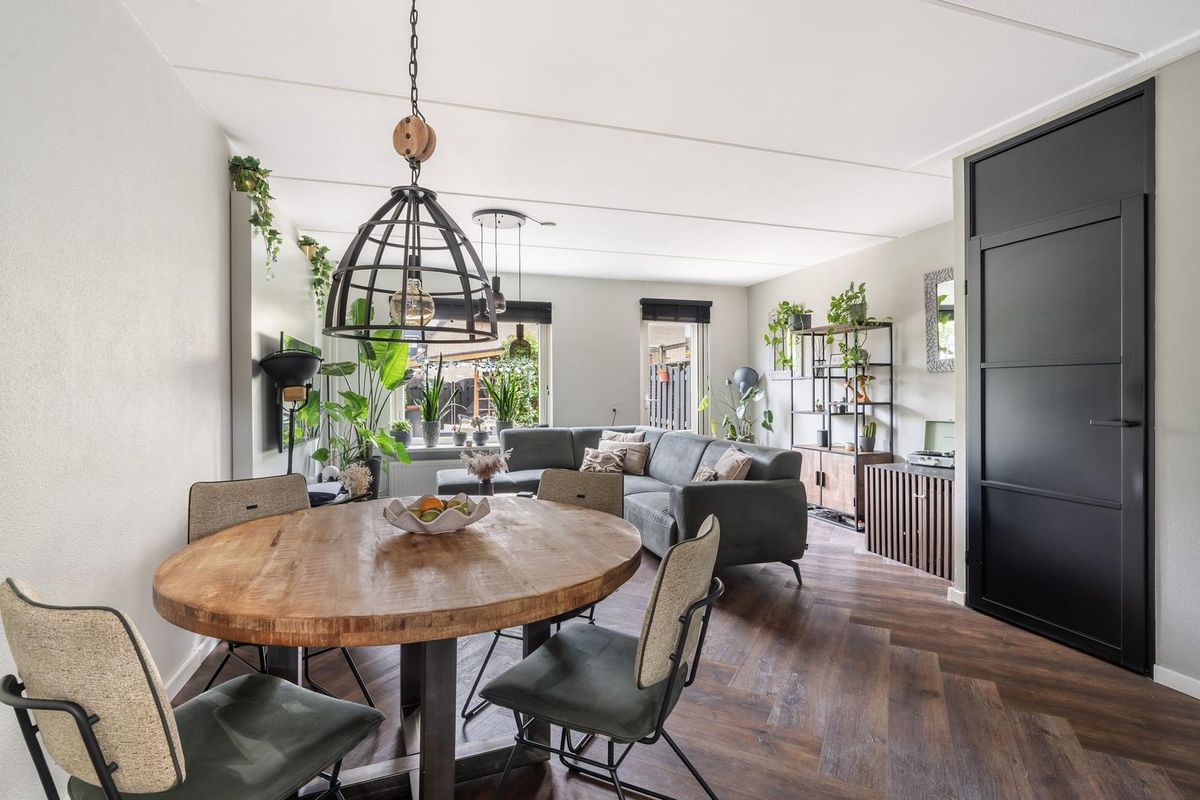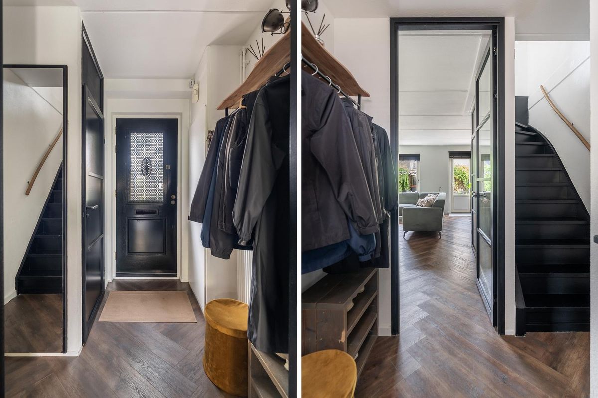 De royale woonkamer ademt direct sfeer dankzij de mooie zwarte deuren, de warme visgraat pvc-vloer en de prettige lichtinval. Onder de trap is een handige trapkast gerealiseerd en via een deur is er direct toegang tot de achtertuin.