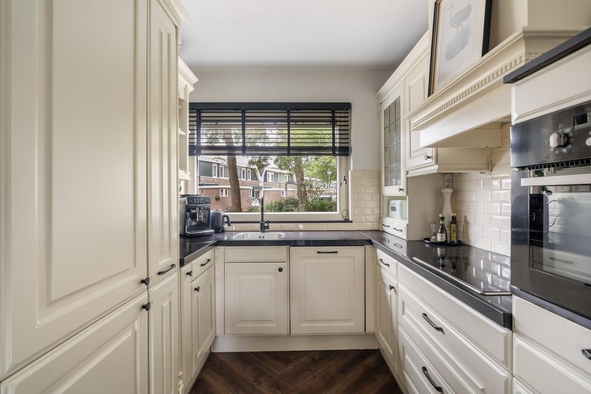 De open keuken, opgesteld in een praktische U-vorm, is uitgevoerd in een zachte crèmetint met een stijlvol zwart natuurstenen werkblad en betegelde achterwanden. Hier vind je diverse inbouwapparatuur zoals een inductiekookplaat met afzuigschouw, een combimagnetron, koel-vriescombinatie, designkraan en volop kastruimte.