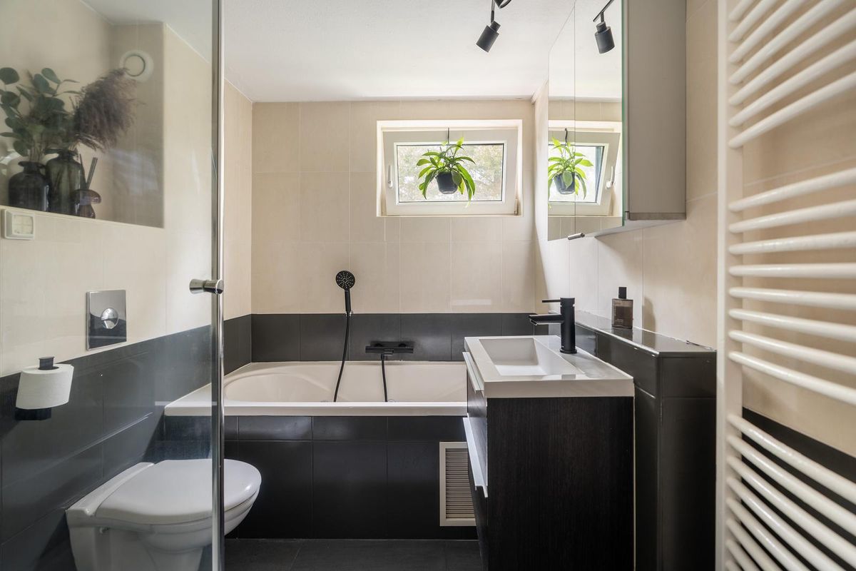 De badkamer is volledig betegeld in een chique combinatie van zwart en crème en uitgerust met een ligbad, douchecabine, tweede wandcloset, brede wastafel met meubel en designkraan, een spiegelkast en een designradiator. Dankzij het raam geniet de ruimte bovendien van natuurlijke ventilatie en lichtinval.