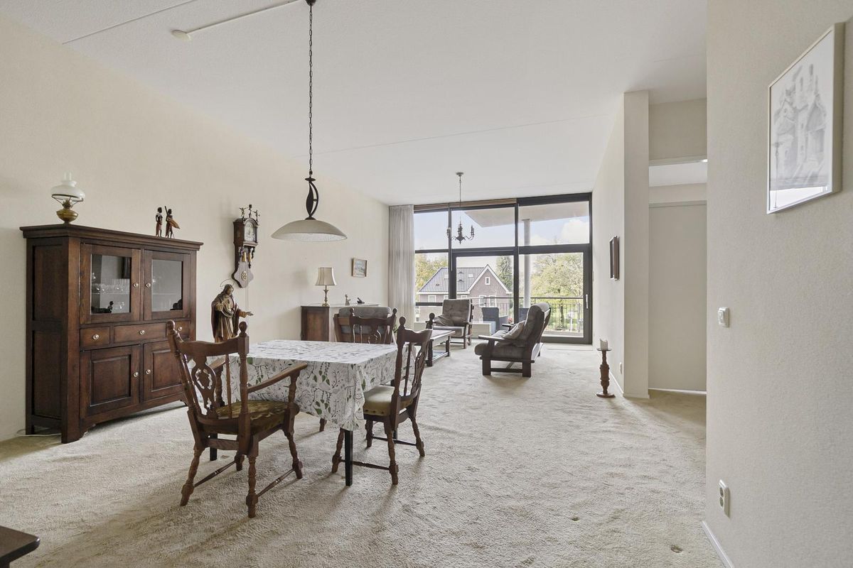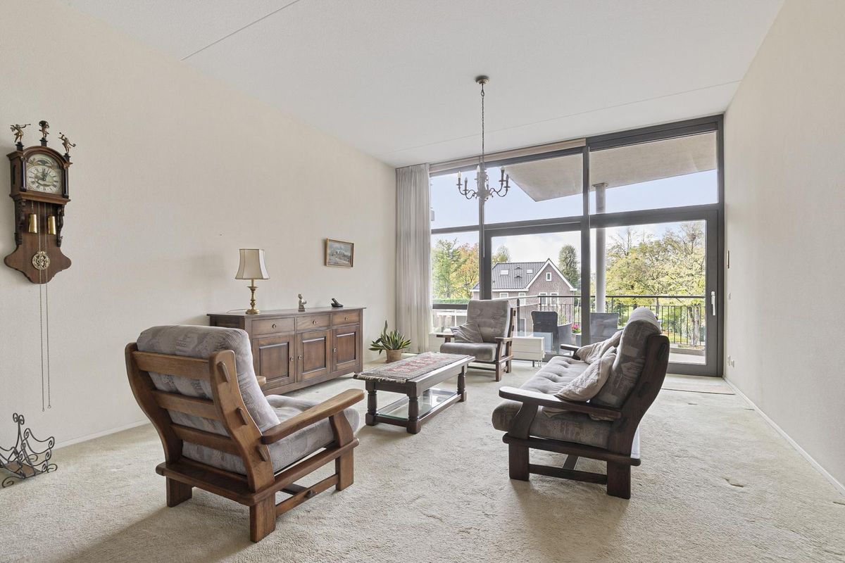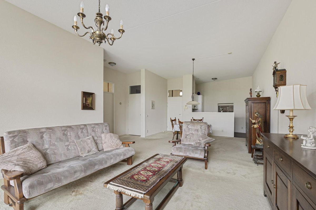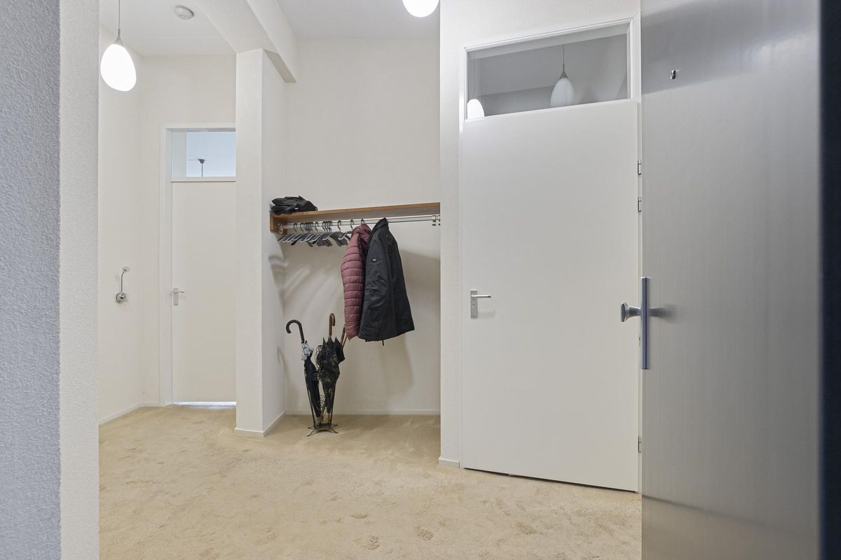 Via de entree op de eerste verdieping wordt toegang geboden tot een royale hal.. Aangrenzend ligt een praktische bijkeuken met een grijze vinylvloer en aansluitingen voor wasmachine en droger. Tevens bevinden zich hier de mechanische ventilatie en de opstelplaats voor de cv-ketel (Remeha Kombi Kompakt HR 22 uit 2004). Het separate toilet is verzorgd uitgevoerd met wit/grijsblauwe betegeling en een fontein. De hal leidt naar de ruime woonkamer, die opvallend licht en royaal is dankzij de hoge plafonds en grote raampartijen. De schuifpui aan de achterzijde geeft toegang tot een ruim balkon in karakteristieke puntvorm. De beige vloerbedekking en de spachtelputz wandafwerking zorgen voor een neutrale en verzorgde basis.