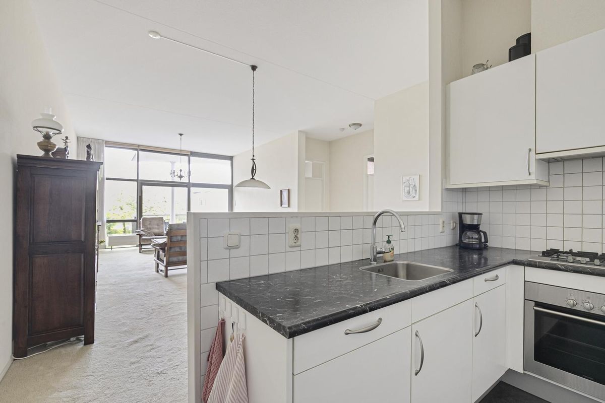 De open keuken bevindt zich aan de galerijzijde; vormgegeven in een hoekopstelling en ingericht met witte onder- en bovenkasten, een 4-pits gasfornuis, oven, afzuigkap, vaatwasser en koelkast. Een klein raam aan de galerijzijde zorgt voor extra lichtinval.