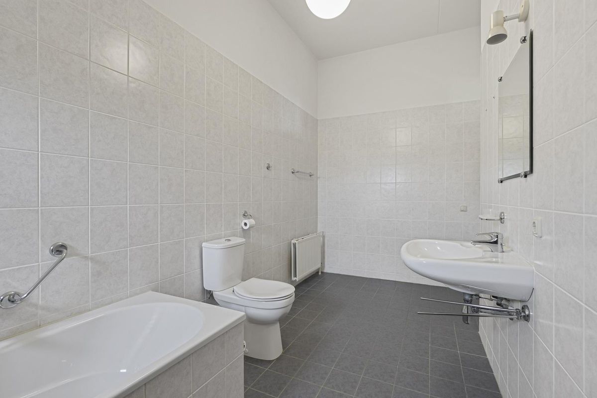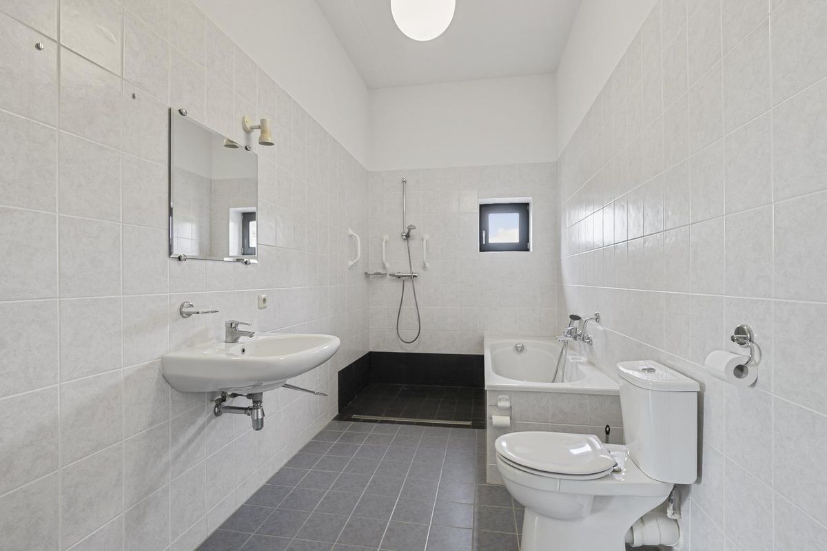 De badkamer is ruim en afgewerkt in dezelfde kleurstelling als het toilet. Hier bevinden zich een groot ligbad, een toilet, een wastafel en een inloopdouche. Ook hier zorgt een klein raam voor natuurlijke lichtinval.