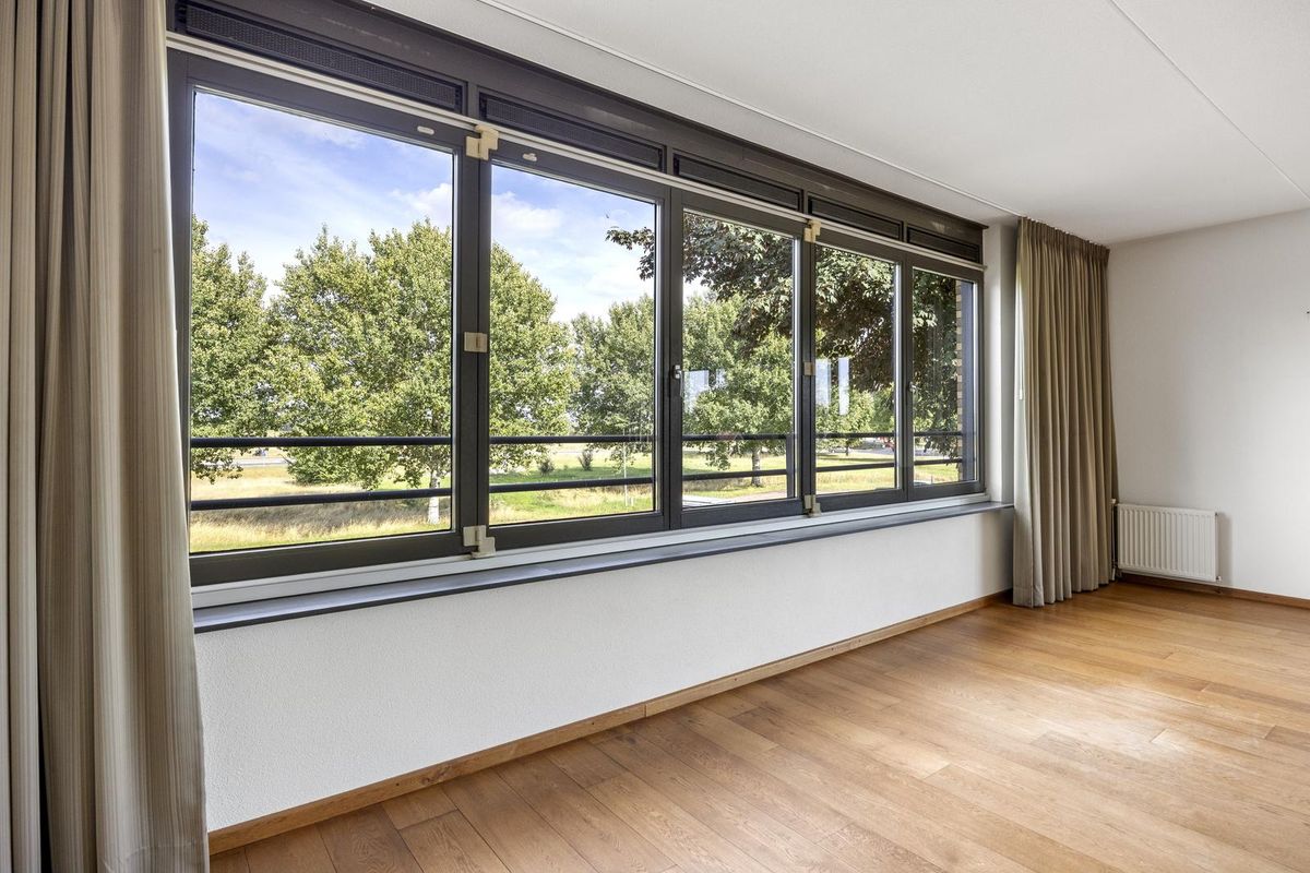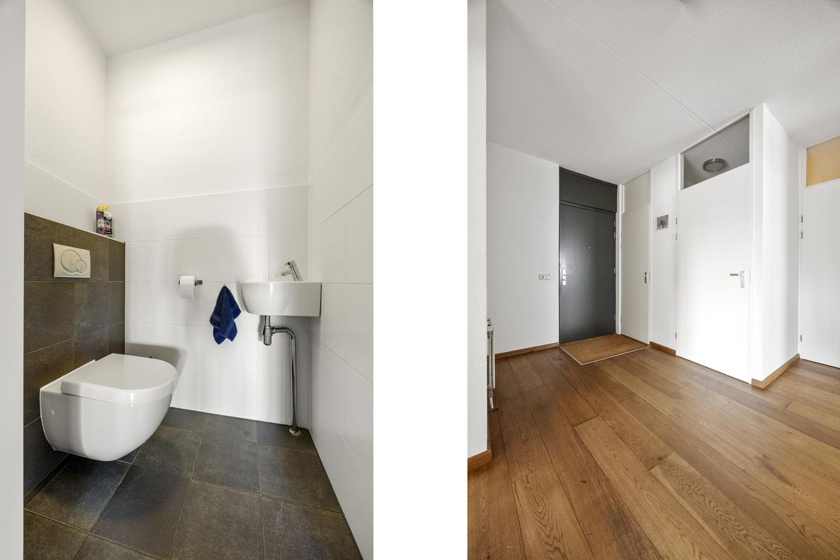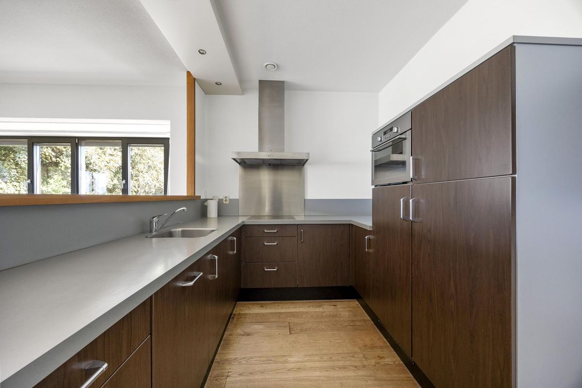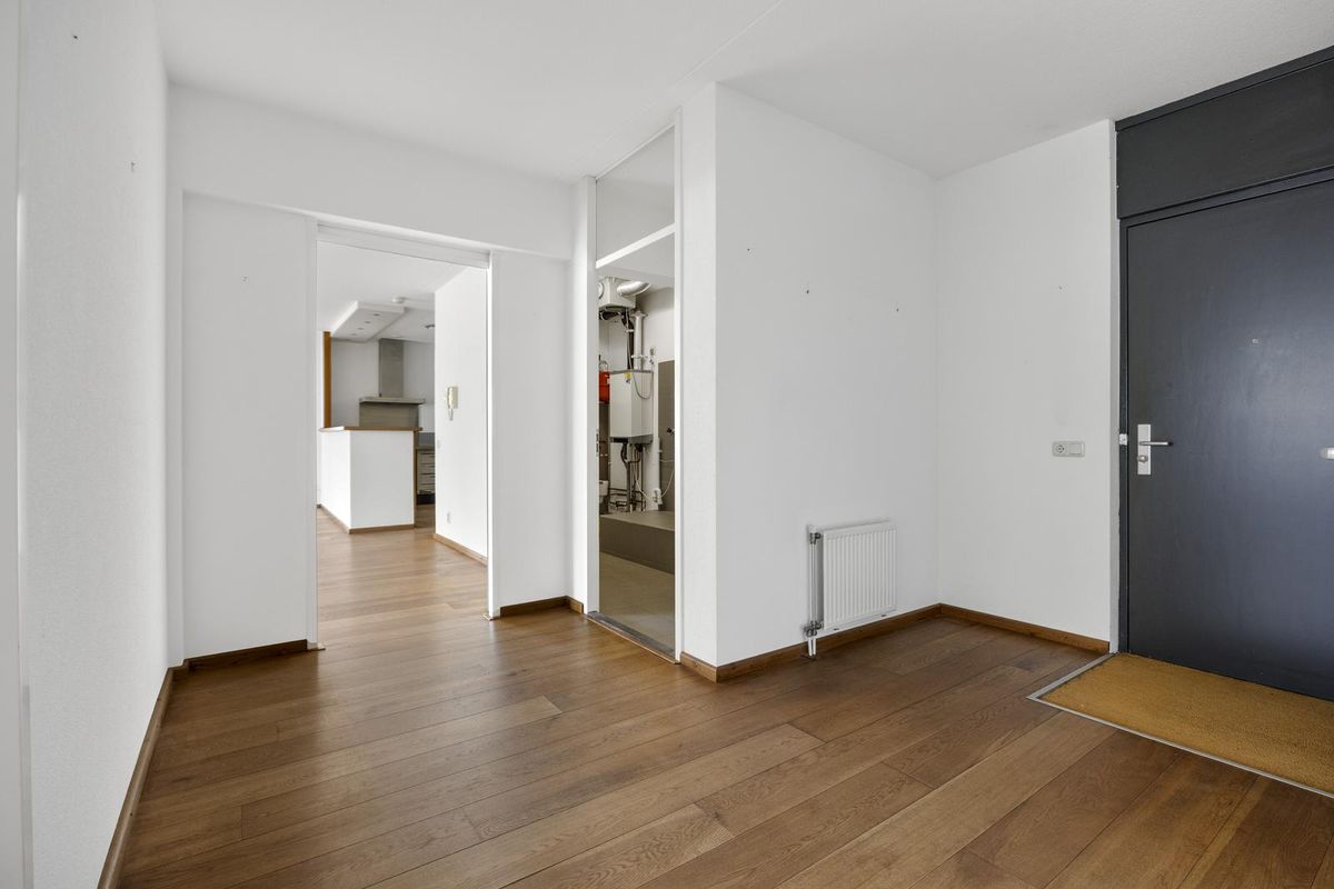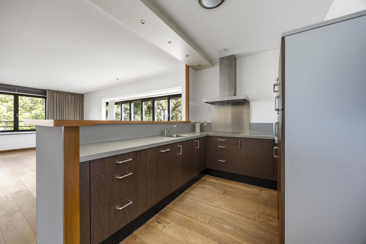 Appartement op de tweede verdieping: loopbrug naar het appartement met ruimtelijke hal met meterkast, plaats voor een garderobe en deuren naar alle ruimten in het appartement: het verzorgde gastentoilet (met wandcloset, fontein en afzuiging) en ruime multifunctionele berging met plateau met aansluitingen voor wasmachine en –droger op hoogte, opstelplaats van de cv-ketel (Intergas Kompakt HRE, 2004, eigendom) en unit voor mechanische ventilatie. Een groot (harmonica)raam en brede erker geven de riante, lichte living aan twee zijden een weids uitzicht over de dijk en haar uiterwaarden en het centrum van Huissen. De met de woonkamer in verbinding staande halfopen keuken is volwaardig en praktisch ingericht met een vaatwasser (ca. 2024), koelkast, separate 3-ladenvriezer, 4-pits ceramische kookplaat, een brede afzuigkap en een combimagnetron. Natuurlijk is er voldoende bergruimte in de laden en kasten en er is een (binnen)raam richting de galerij.