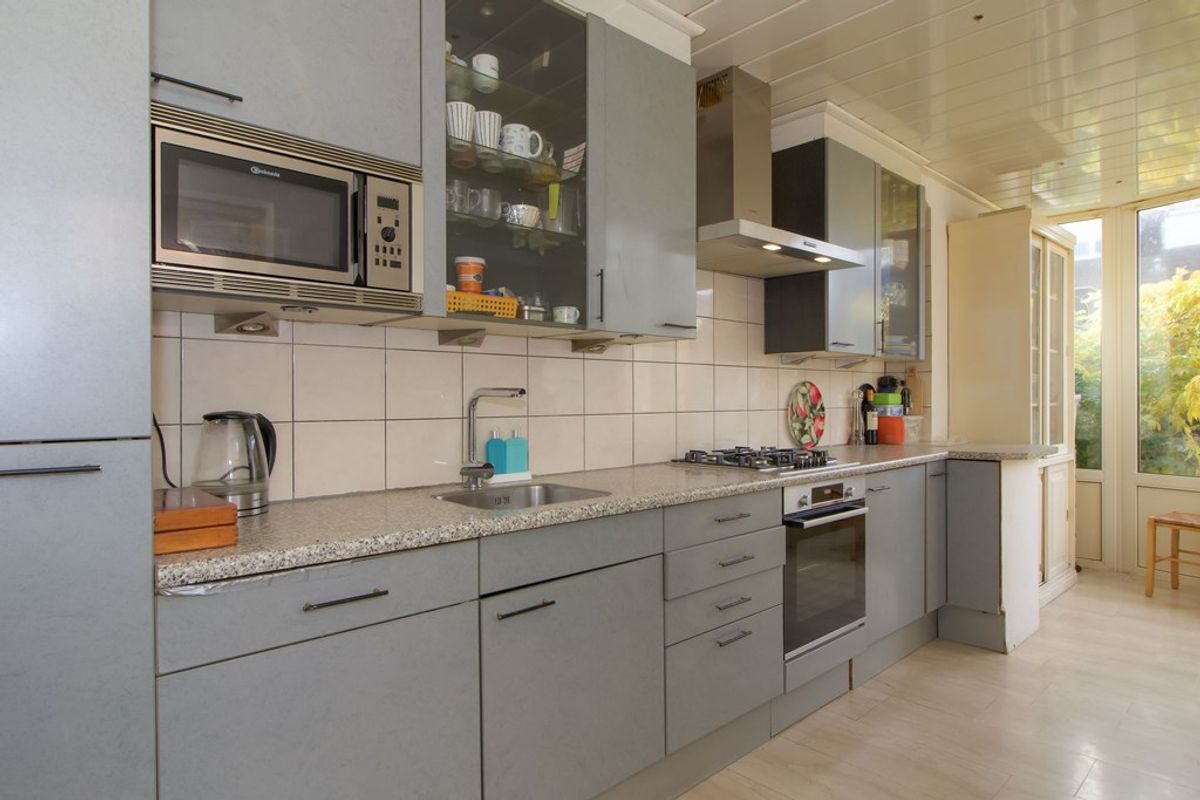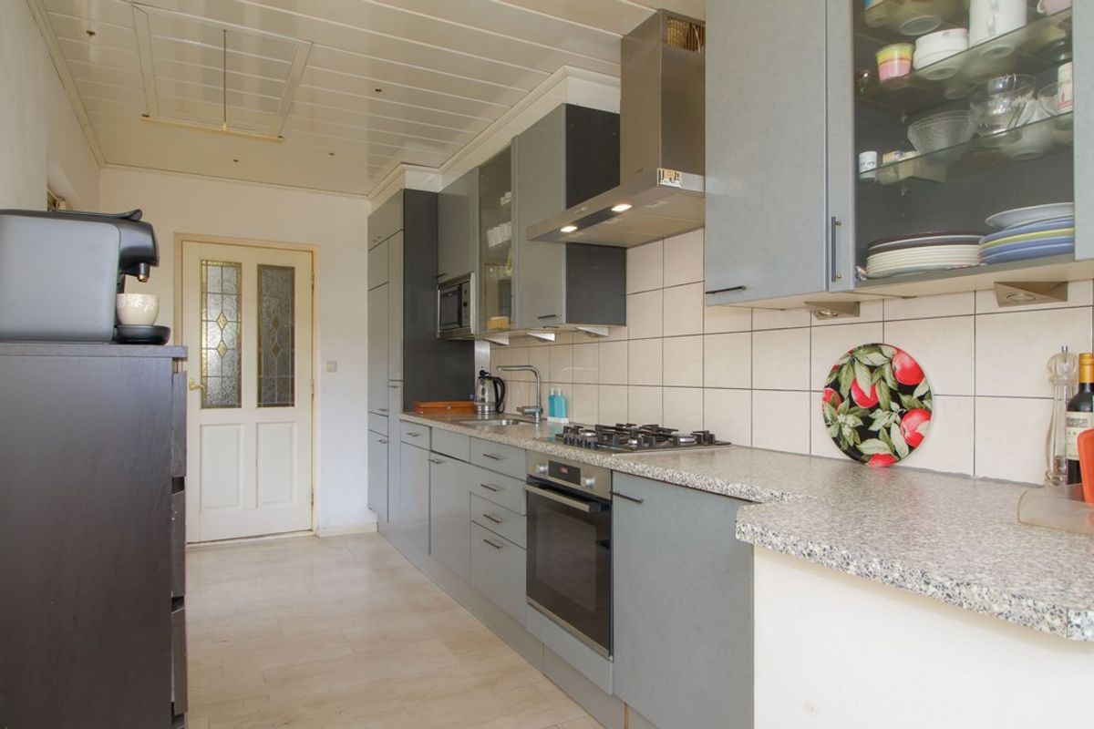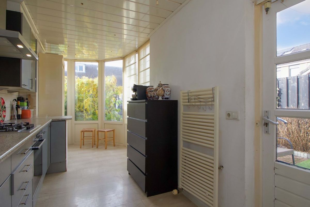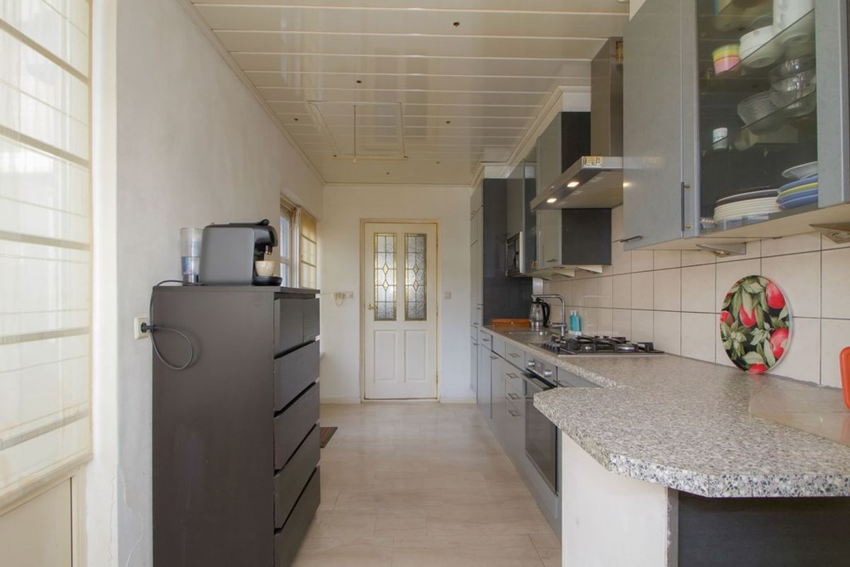 Aan de achterzijde in de uitbouw bevindt zich de keuken. De keuken is voorzien van een ruime werkbladopstelling en voldoende kastruimte. Vanuit de keuken is er direct toegang tot de achterzijde van de woning, waar zich bijvoorbeeld de tuin of buitenruimte kan bevinden.
