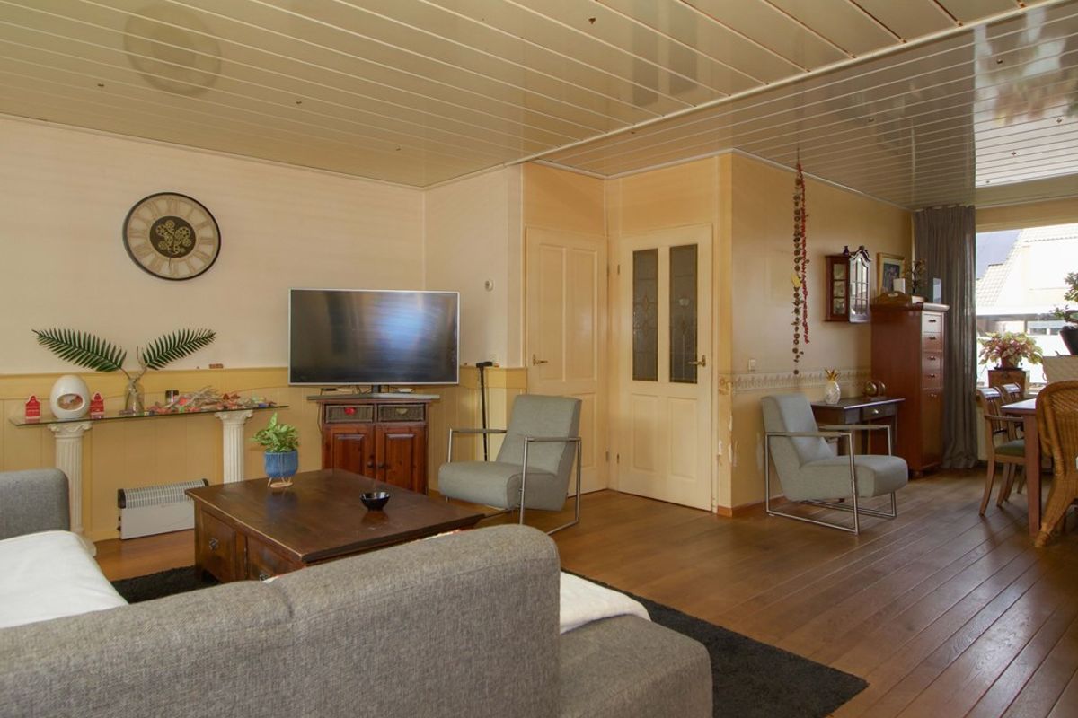 De woonkamer strekt zich over de volledige breedte van de woning uit en biedt volop ruimte voor een comfortabele zithoek en een aparte eethoek aan de achterzijde.