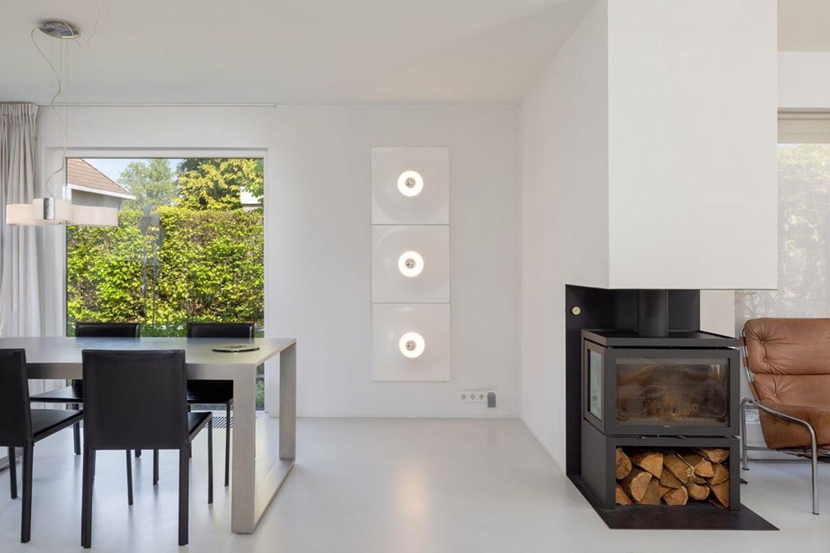 In het lichte ontwerp met witte vloeren en wanden zijn bewust houtaccenten toegevoegd. De houtsoorten Wengé en Afzelia geven warmte en karakter aan het geheel, zichtbaar in onder meer de ‘reed bunting’ trap, het keukeneiland en de werkkamer. Daarnaast vormt de houtkachel een centraal element in de leefruimte: een plek waar bewoners en gasten samenkomen.