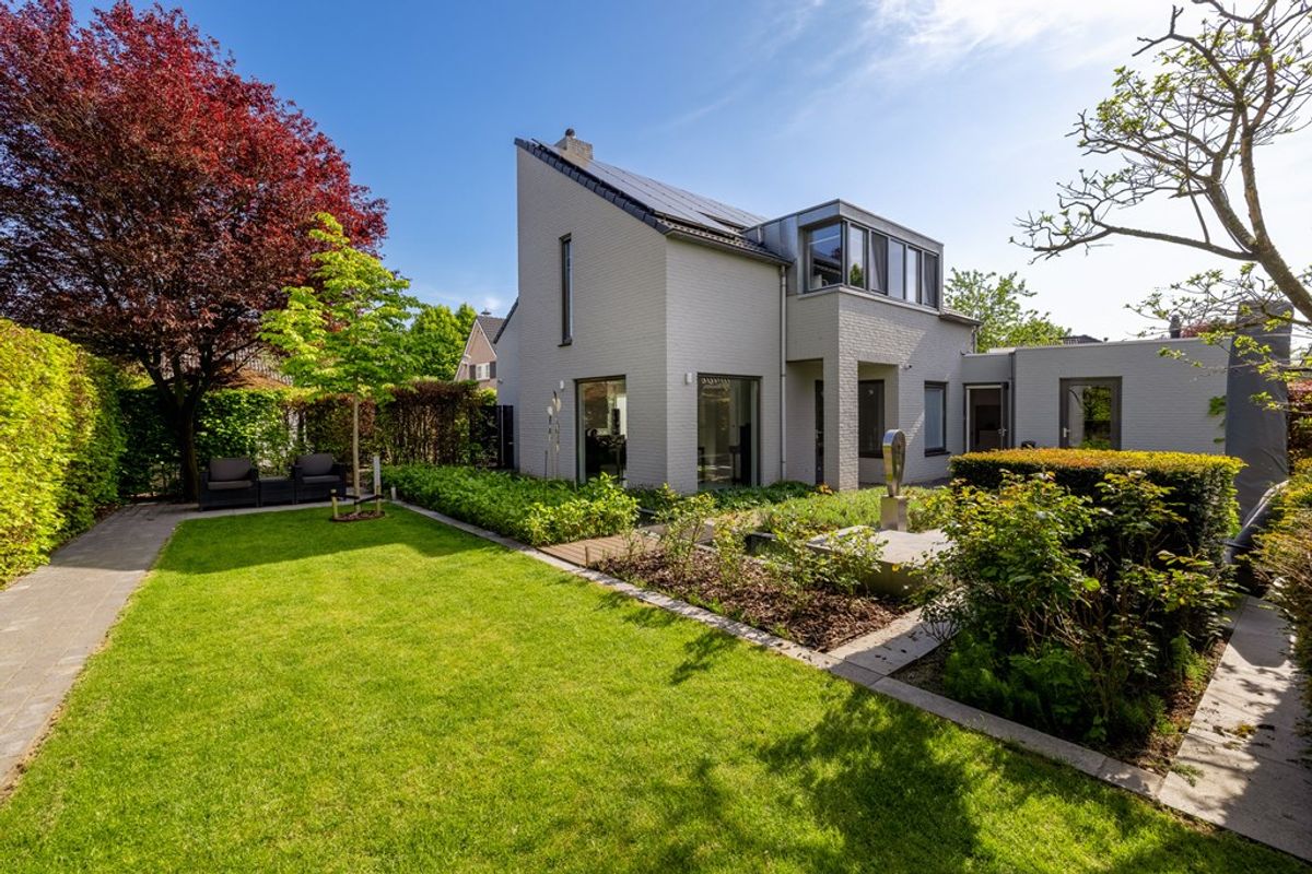 De onder architectuur aangelegde tuin is meer dan een buitenruimte: het is een verlengstuk van de woning. Vier terrassen bieden elk een eigen sfeer en bezonning, zodat er altijd een perfecte plek is om te zitten. De overloop vijver, sierlijke paden en zorgvuldig gekozen beplanting maken van de tuin een oase van rust. Binnen en buiten lopen hier in elkaar over – alsof de tuin een extra kamer is.