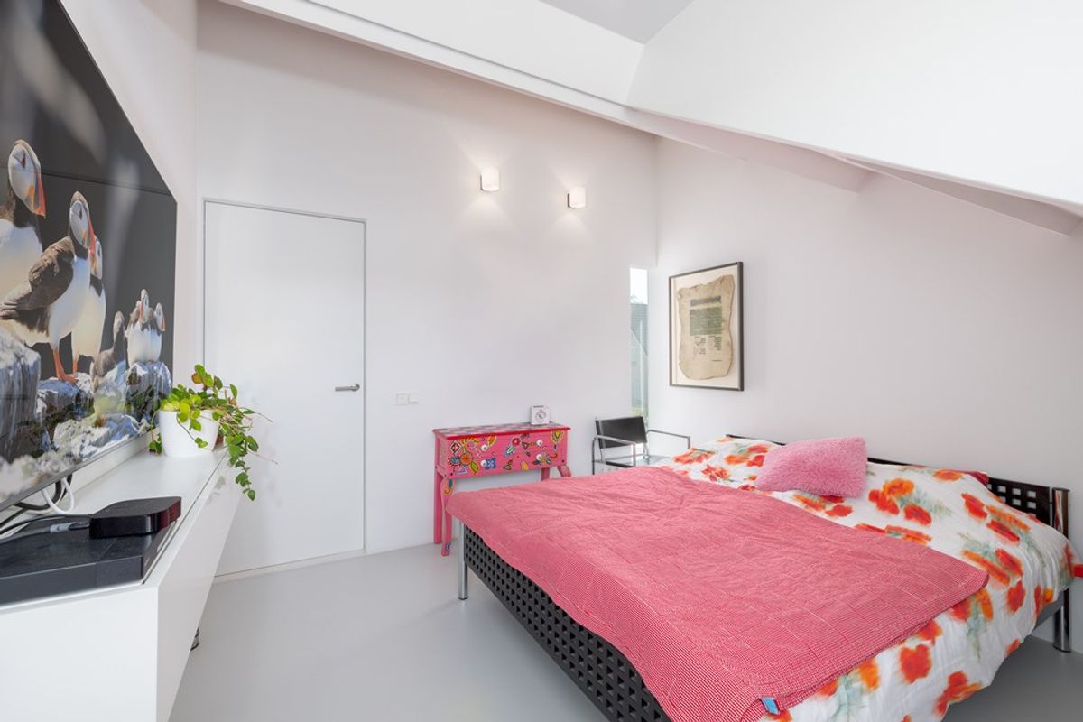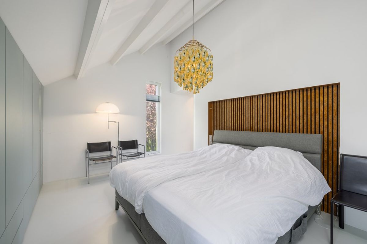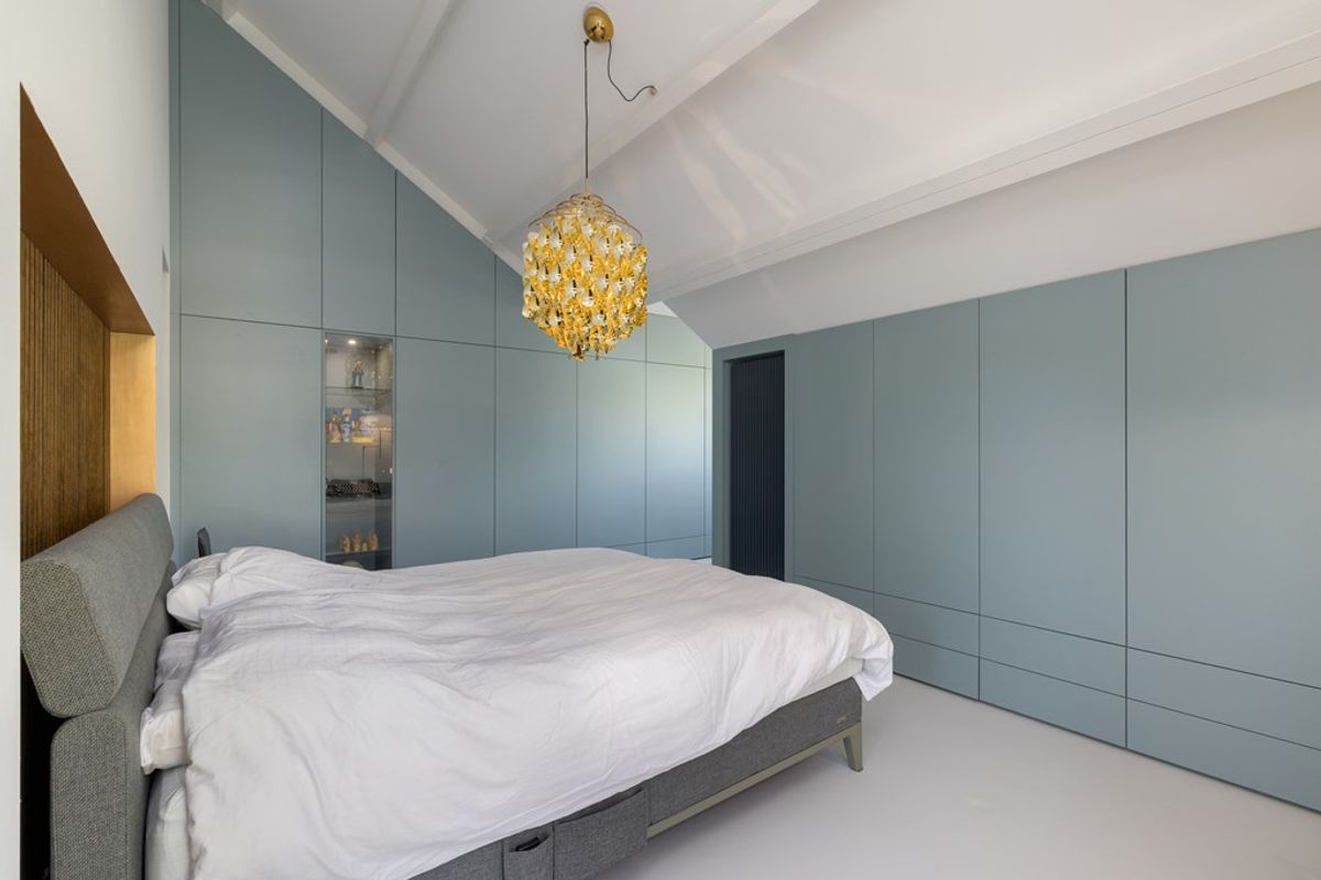 Deze master bedroom ademt ruimte. Maatwerkkasten langs twee wanden zorgen voor rust en overzicht. Een gezellige zithoek of werkplek maakt het compleet perfect voor een goed boek, een espresso, of gewoon even niets. Licht, lucht en luxe komen hier vanzelf samen.