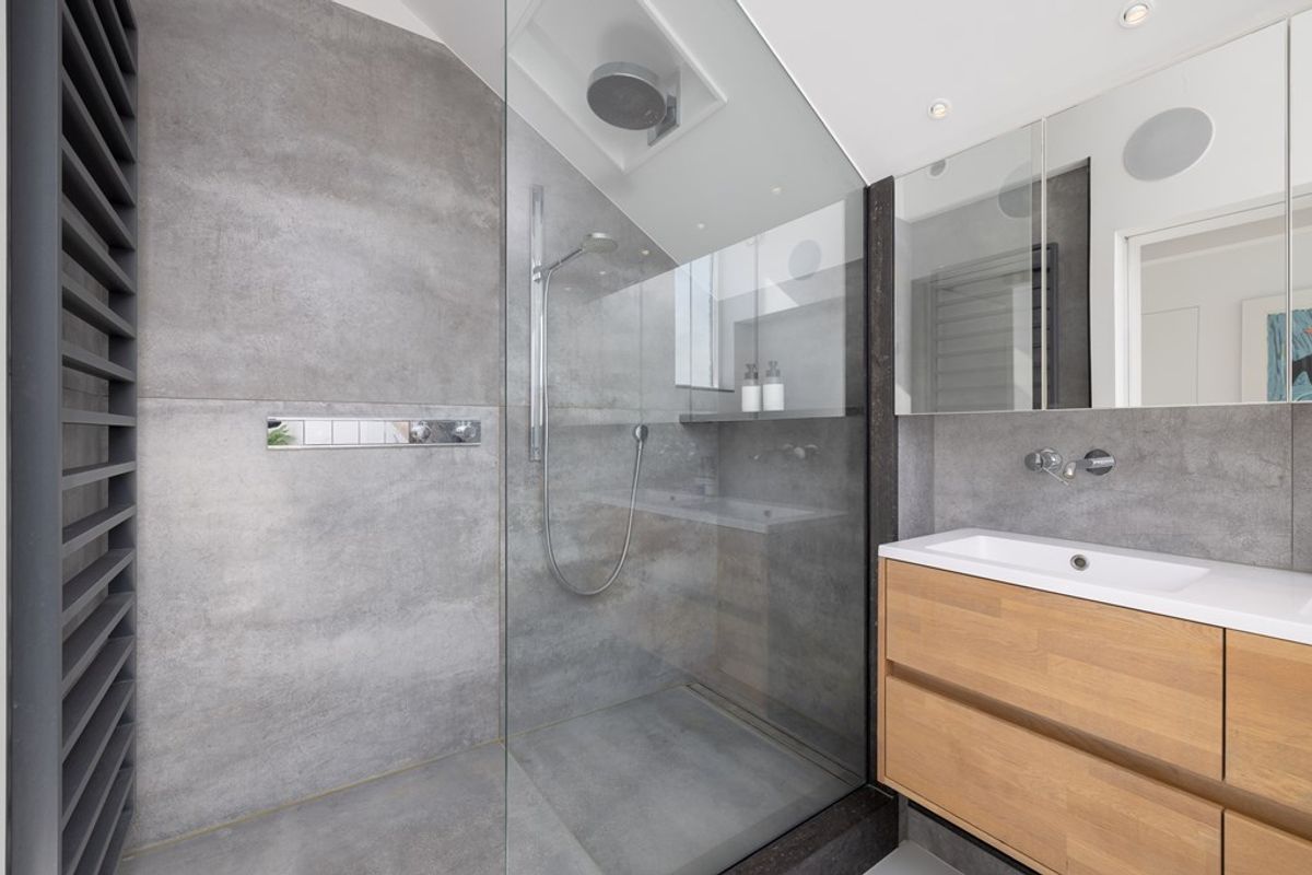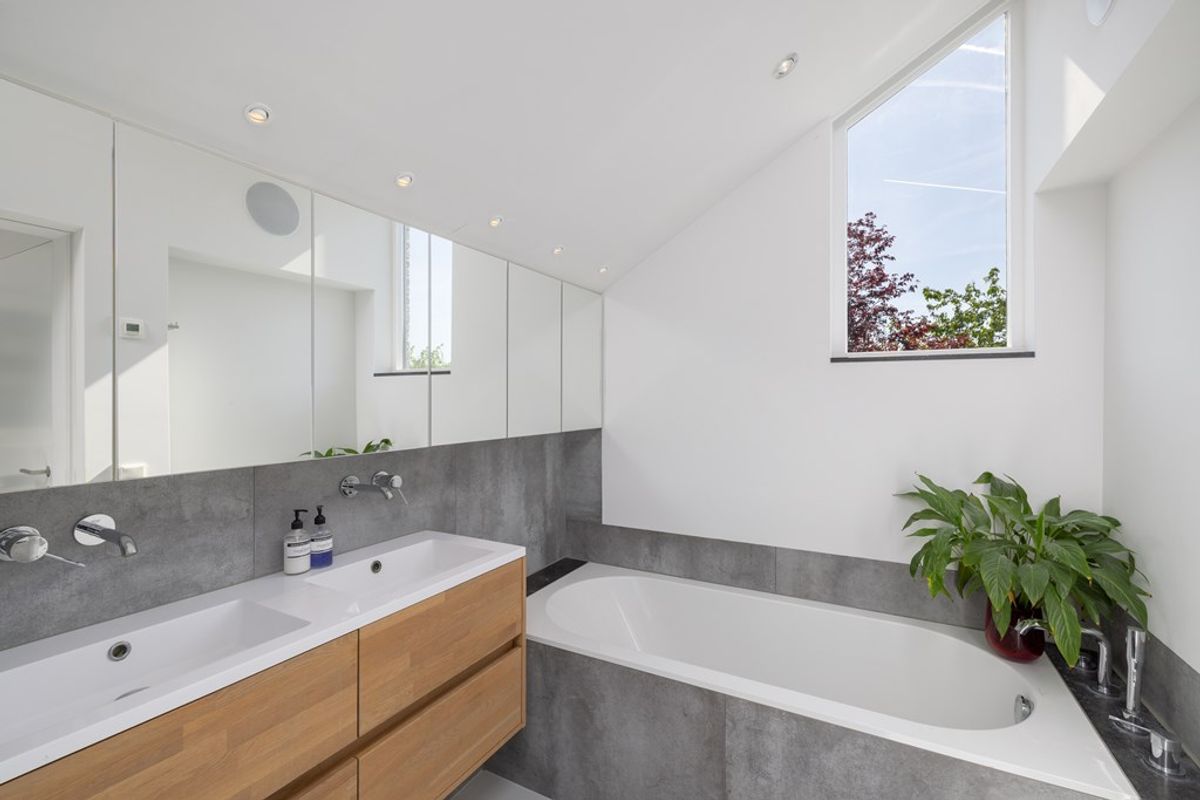 De luxe badkamer heeft moderne, tijdloze afwerkingen, zoals een inloopdouche, ligbad en dubbele wastafel, alles in perfecte harmonie met de rest van het huis. De eerste verdieping biedt een perfecte balans tussen comfort, privacy en stijl.