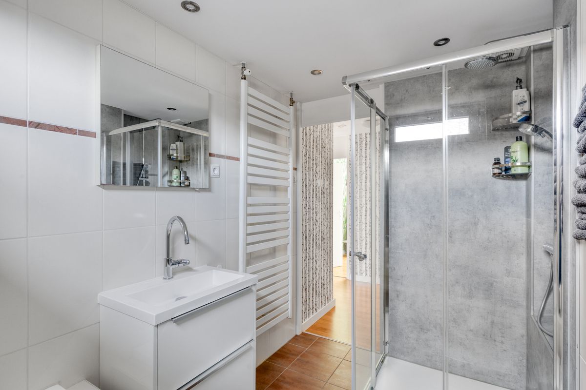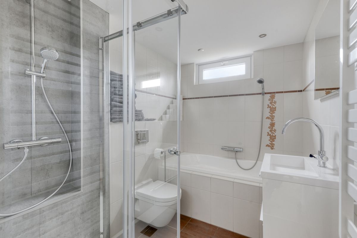 De badkamer is in 2024 deels gerenoveerd en uitgerust met een ligbad, een aparte douche, een tweede toilet en een modern wastafelmeubel.