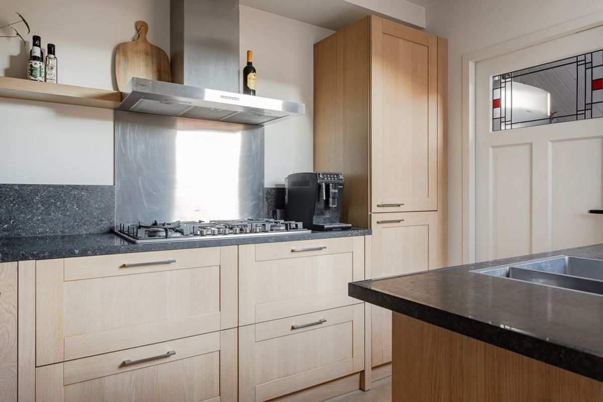 Halfopen keuken, compact maar heel praktisch ingericht! Er is een hoog natuurstenen werkblad met waterkering, 1½ spoelbak, kunststof draai/kiepraam met HR++ glas boven het werkblad, meerdere stopcontacten en veel laden, kastjes, een carrouselkastje en bovenkastje met bladverlichting. Daarnaast ook nog plek gemaakt voor de nodige inbouwapparatuur, zoals: een combimagnetron, separate oven, vaatwasser (2024), koel/vriescombinatie met een 4 laden vriezer, 6 pits gaskomfoor en een rvs-afzuigkap met de afvoer rechtstreeks naar buiten.