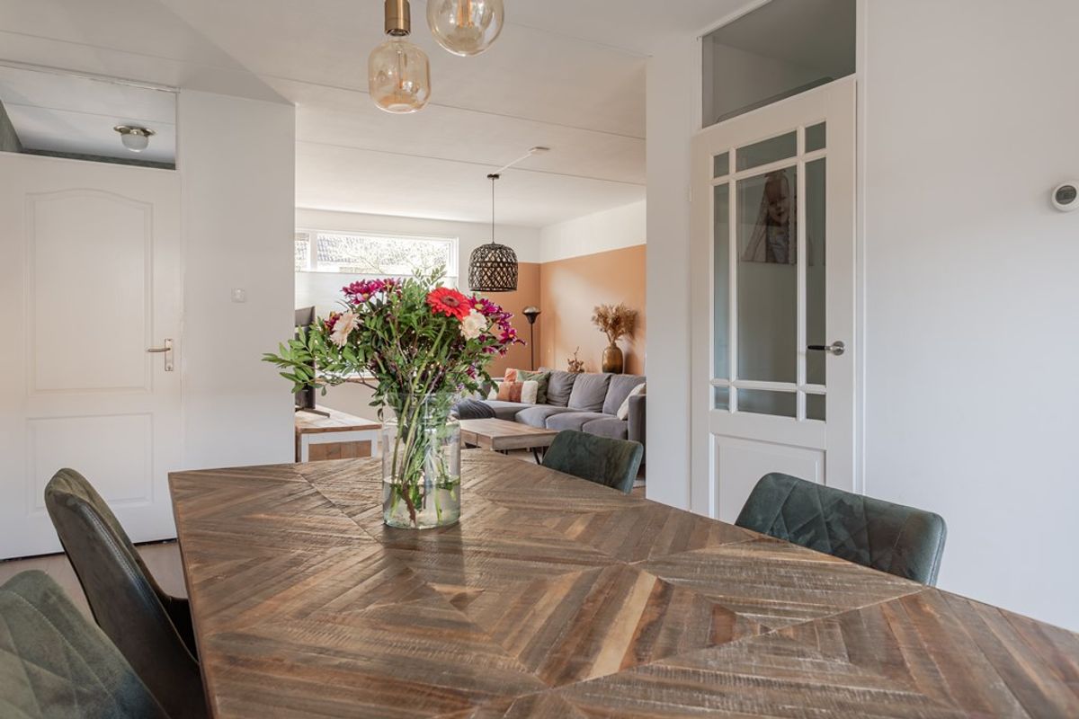 De sfeervolle en trendy living heeft strak gestuukte wanden, op de vloer is een laminaat met brede vloerdelen gelegd en in 2023 zijn de kunststof kozijnen met HR++ glas en ventilatieroosters geplaatst. De ruimte wordt verwarmd door de heteluchtverwarming, dus geen stoffige radiatoren. Bij de eethoek naast de halfopen keuken zijn in 2023 ook kunststof openslaande deuren geplaatst met HR++ glas. Echt een fijne woonruimte voor uzelf, een gezin en om vrienden en kennissen te ontvangen.